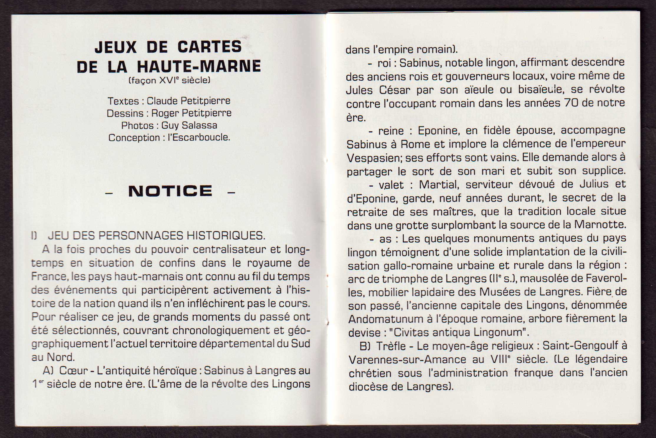 Above: Jeux de Cartes de la Haute-Marne, Imp. Gamonet, Chaumont, France, 1990. 2 x 52 cards + 2 Jokers + 16-page booklet in French, in double plastic box. Size: 59 x 89 mm.