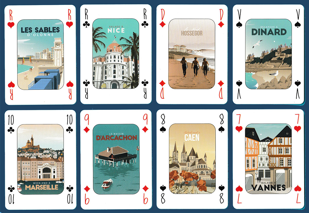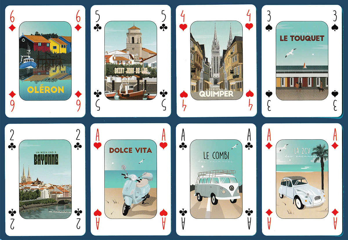 Thumbing through this pack might give you some fresh ideas for places to visit around the French coast. Indeed, these are essentially modern travel posters, executed in soft, pastel colours by the illustrator Pauline Launay. The areas covered include Normandy, Brittany, the Vendée, Charente-Maritime, the Landes, the Basque Country and Provence. Each town or village is named. Means of transport are featured on the aces – a bicycle, a scooter, a 2CV, and a VW camper van. The indices have a hand-drawn look. Seagulls adorn the reverse. See the box