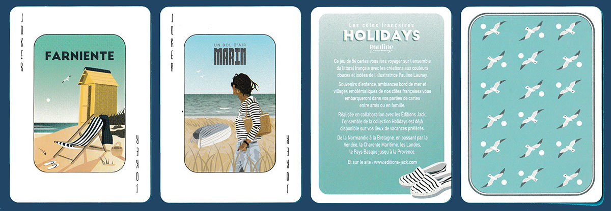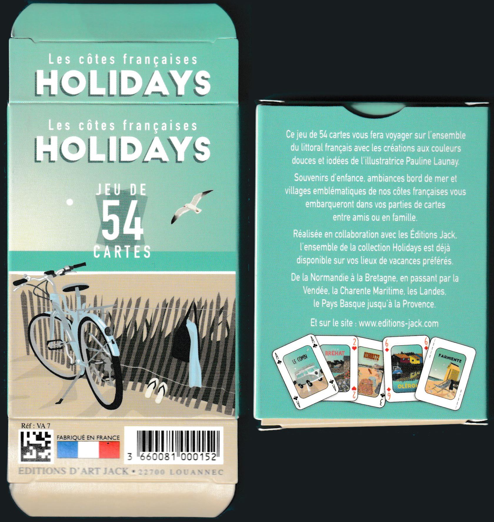 Above: "Holidays – les côtes françaises" playing cards published by Editions d’Art Jack, Louannec, France, c2024. Made in France. 52 cards + 2 Jokers + 1 title card in French, in tuck box. Size: 63 x 88 mm. Purchased in Saint-Jean-de-Luz, May 2024.