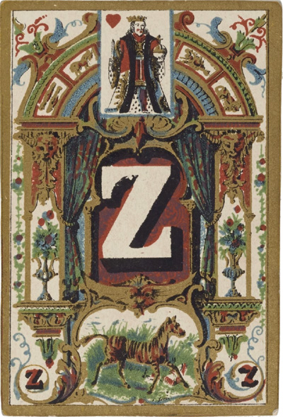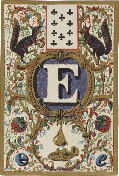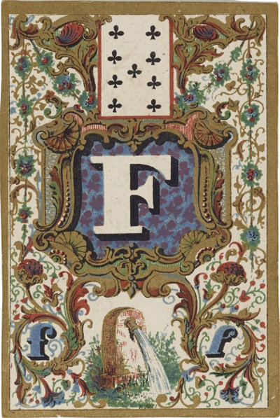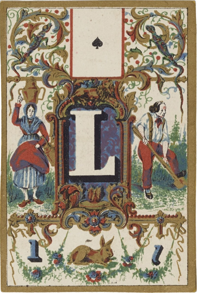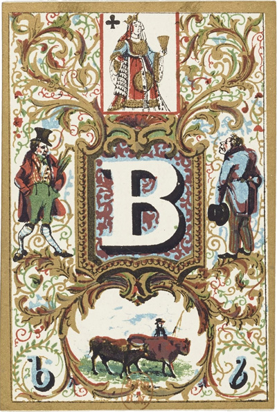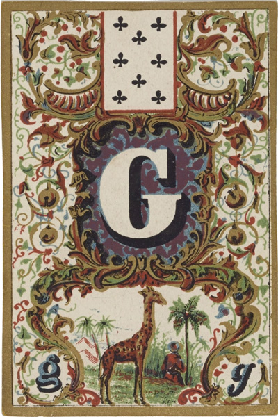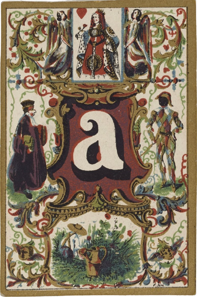 Above: Jeu de Cartes Abécédaire published by Lithographie Musicale de Boboeuf, rue Cadet 23, Paris, 1840. Total of 32 cards + rules in case; square corners; plain white backs; chromolithography; 8.6 x 5.7 cm. Source gallica.bnf.fr / Bibliothèque nationale de France • Jeu de cartes abécédaire►