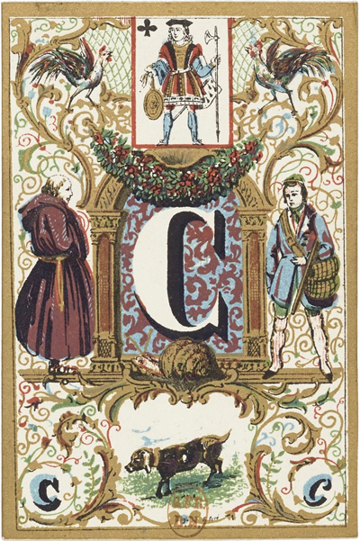 This French educational card set incorporates a card for each letter of the alphabet, totaling 32 cards. Each card is adorned with intricate illuminations and floral decorations in shades of green, blue, red and gold. The illustrations feature amusing characters and vignettes that begin with the same letter as the card itself, for example, "C" for "chien" (dog). This engages the child's imagination so that the deck serves as an initial step towards learning spelling and reading. At the top of each card, there is a miniature playing card in the official Paris pattern.