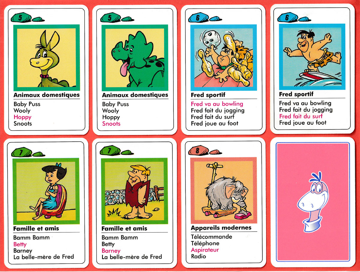 Les Pierrafeu is the French name for The Flintstones. In this quartet game, there are eight sets of four cards, each set having a different, predominant colour. The titles of the sets translate into English as Furniture, Fred, Cars, The Flintstones, Domestic animals, Fred the sportsman, Family and friends, and Modern appliances. The designs are bold, colourful and attractive. The traditional rules of the game apply – these are given in French on the back of the title card►