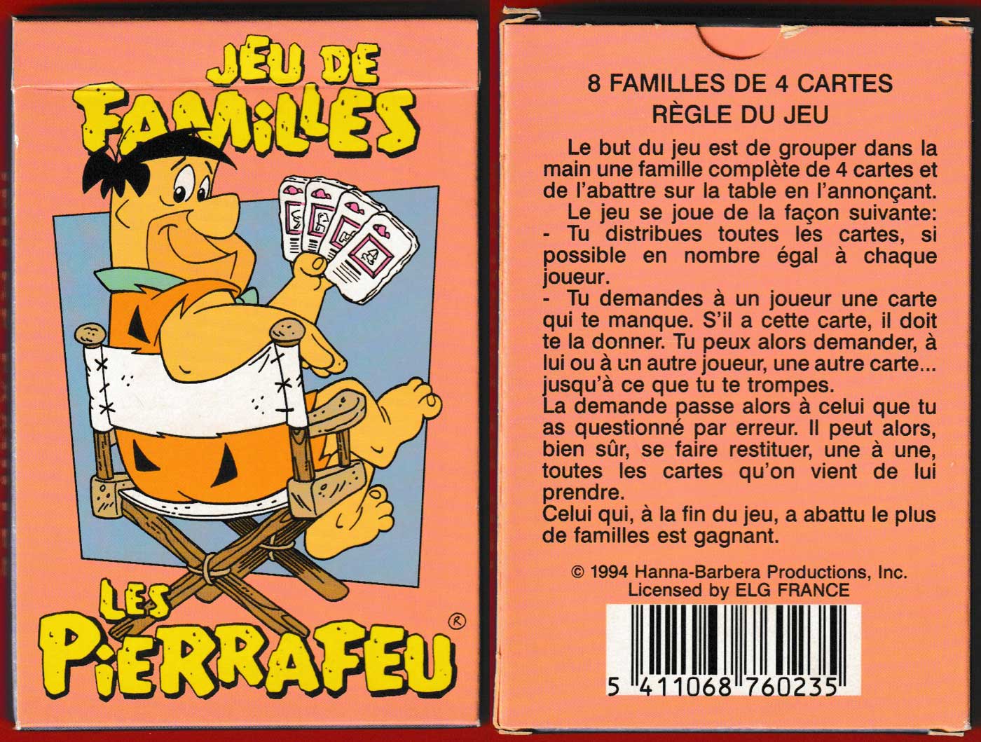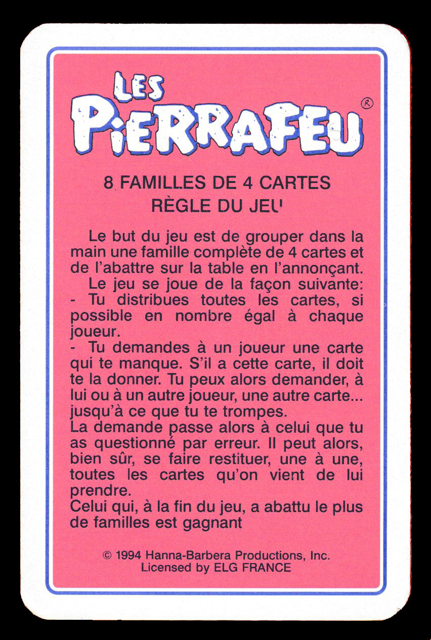 Above: Jeu de Familles Les Pierrafeu printed by Carta Mundi, Turnhout, Belgium, 1994. 32 cards + 1 title/rules card in tuck box. Size: 65 x 100 mm. © 1994 Hanna-Barbera Productions, Inc. Licensed by ELG France.