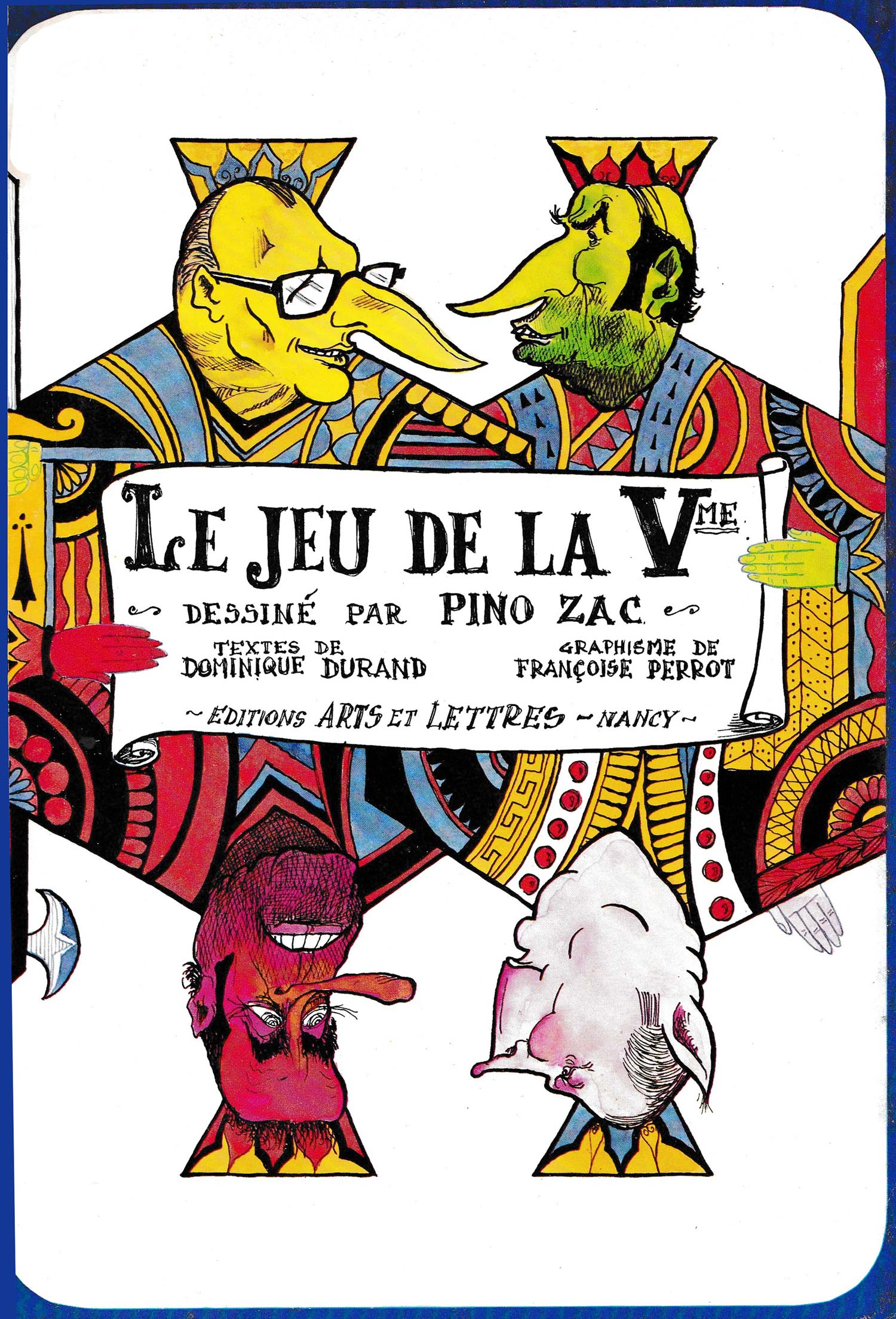 This political pack was designed by Pino Zac and published in 1977 by Editions Arts et Lettres, Nancy. It is unusual insofar as it was published as an A4-size book (with text by Dominique Durand) containing 56 perforated cards and box which could be pressed out to form a boxed pack. • See the press-out box • the cover►
