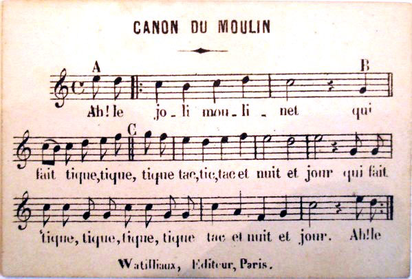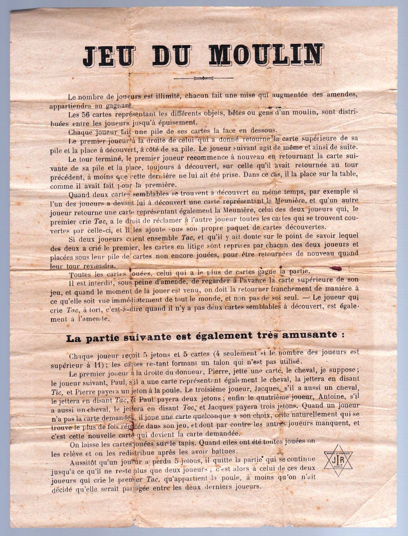 Jeu du Moulin, reminiscent of the old days of millers and water wheels, was designed by Bernard Coudert and first published by Jeux Watilliaux, Paris, in c.1880. Illustrations on the cards include the miller’s boy, the maid, millstones, sacks of flour, hens, ducks, the cat and so on... 14 in total. Watilliaux subsequently became part of Les Jeux Reunis group whose trade mark ‘LJR’ can be seen on the rules sheet in this edition. The card game is played similar to Snap. There is also a musical accompaniment►