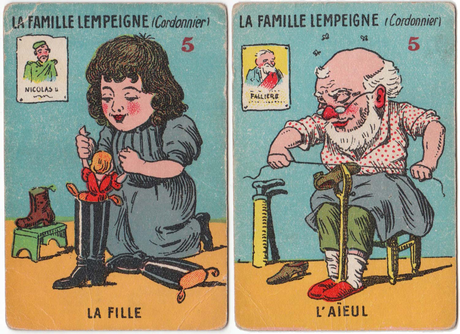 On the Grandfather Cobbler and the Daughter Cobbler cards are portraits on the wall behind them. These concern the French President at the time, illustrations representing Fallières, President of the Republic from 1906 to 1913, and Nicolas II (whom Fallières had met in 1909 in Cherbourg). See close-up here►