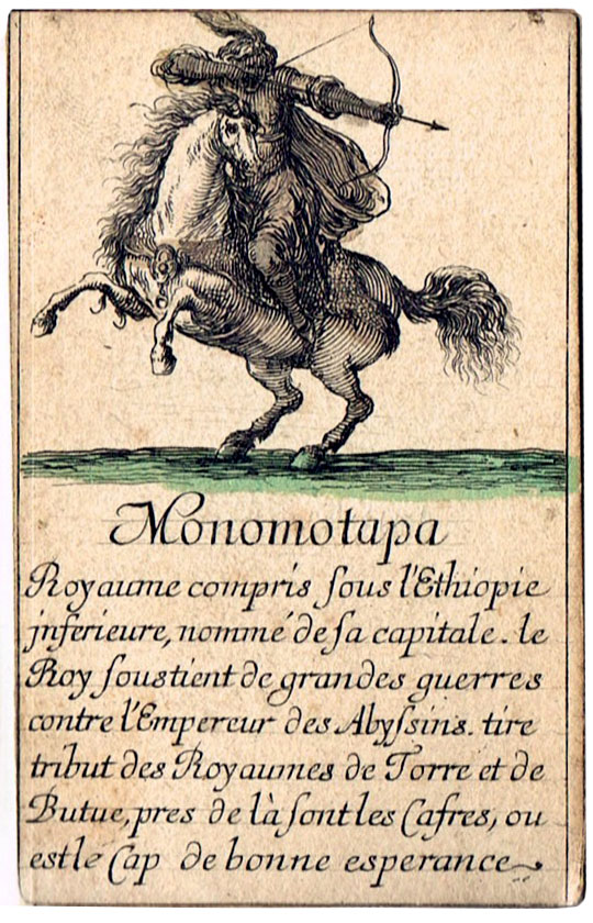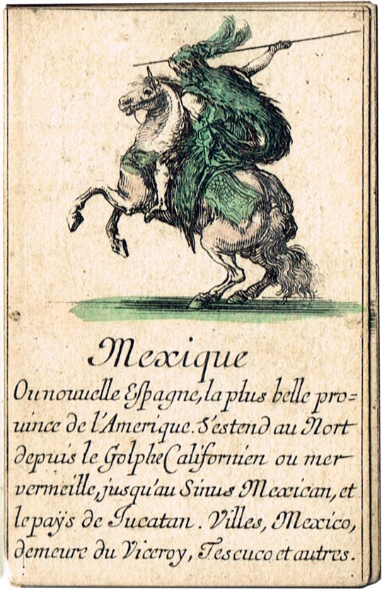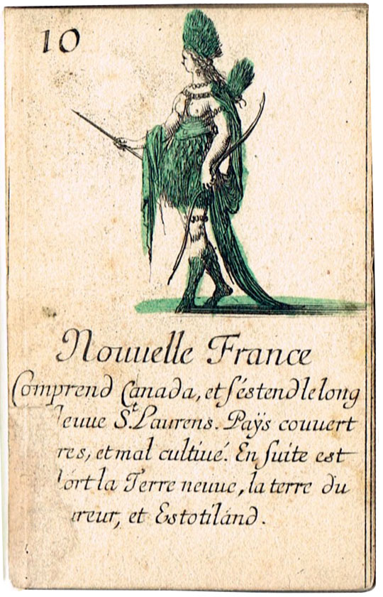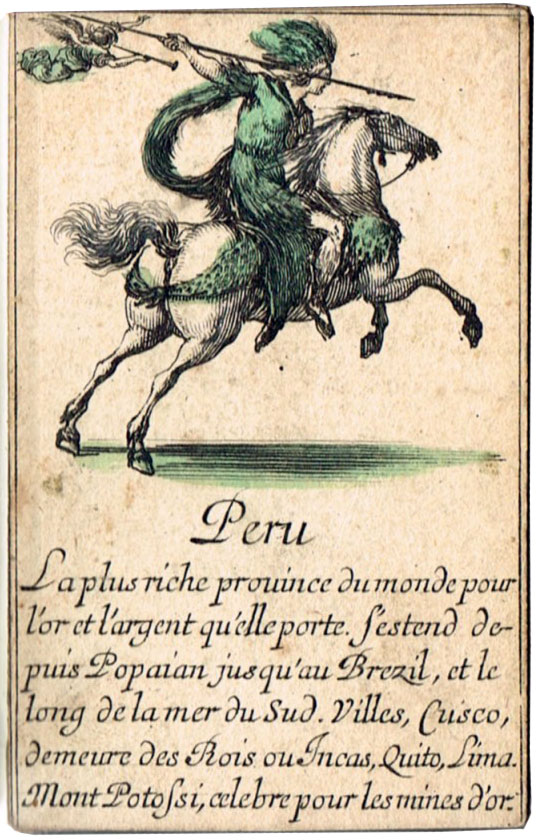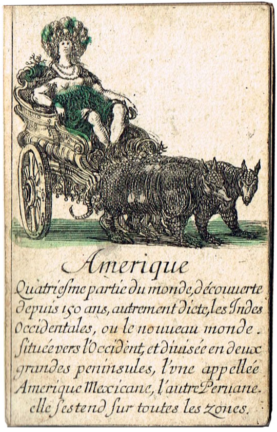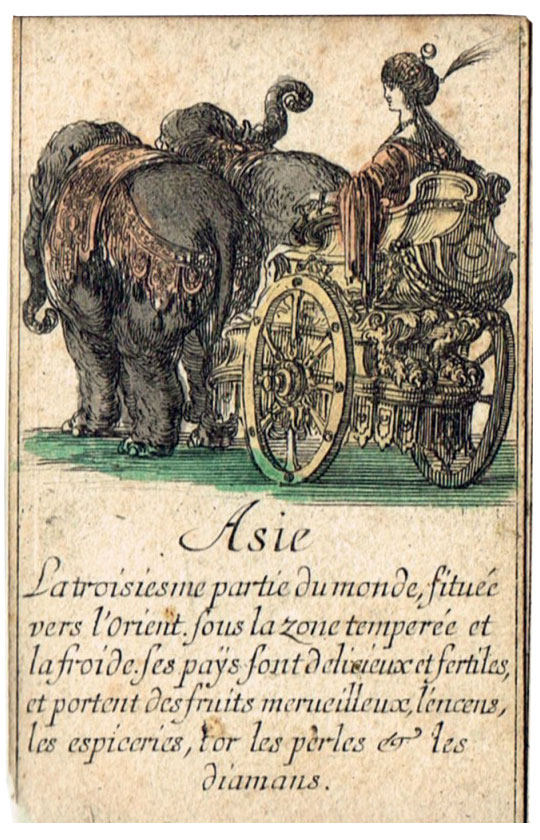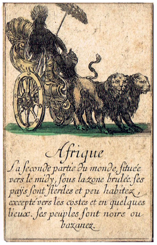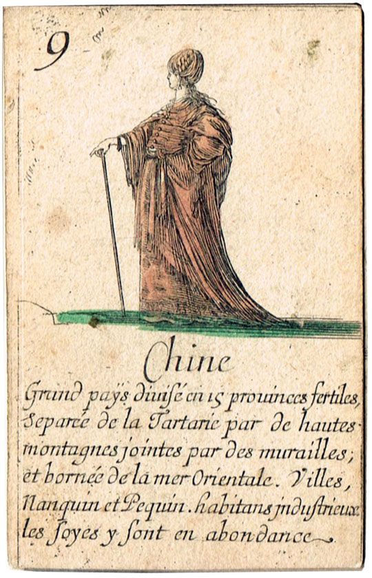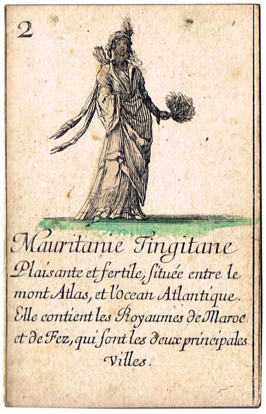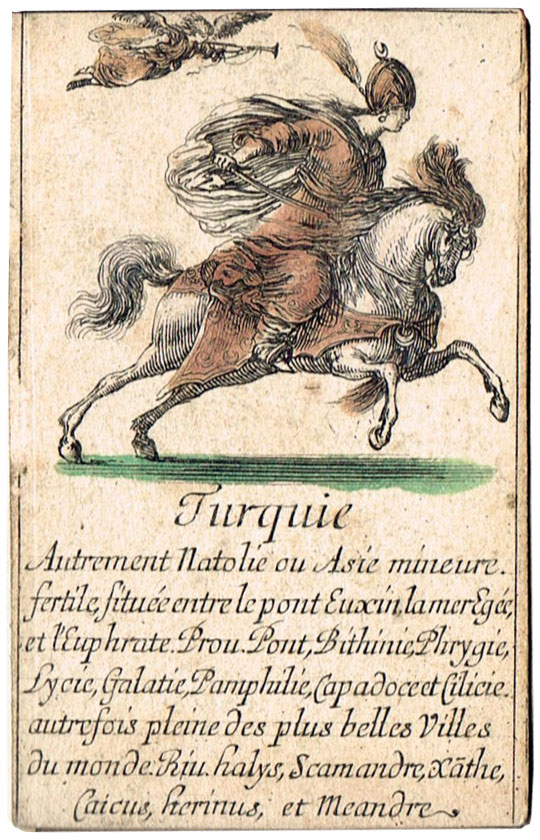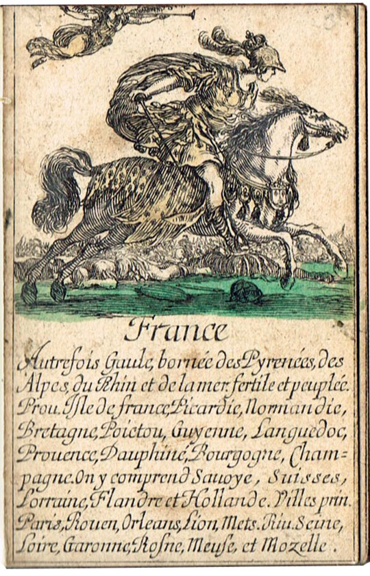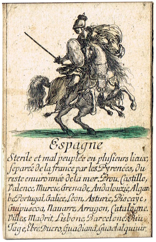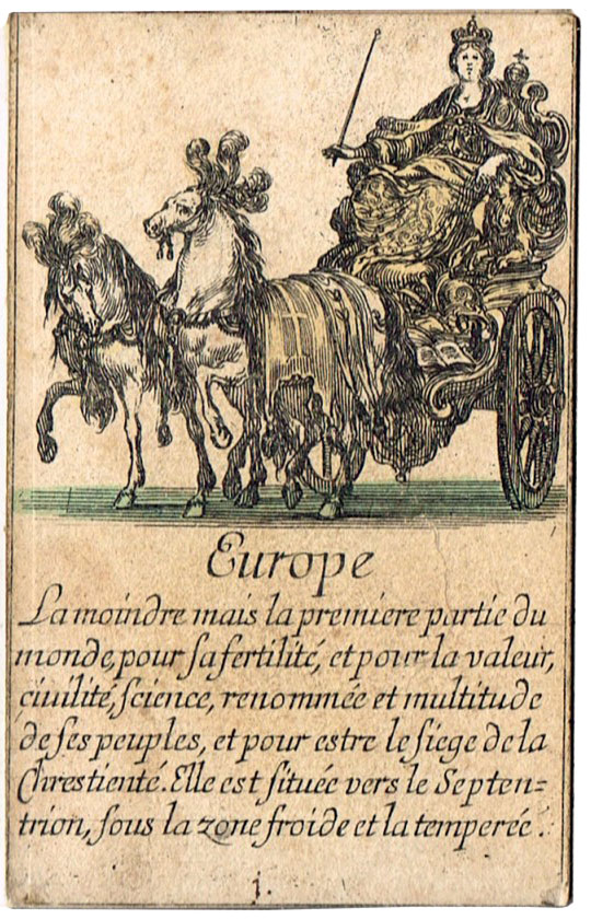Extremely scarce “Jeu de Géographie” playing cards, one of several educational sets etched by Stefano Della Bella (1610-1664) and published by Henry le Gras, c.1644. The cards bear personifications of countries or continents, with allegorical figures. In this set the suit symbols have not been included, but the intention was that the four suits represent the four known continents: hearts are Europe; diamomds are Africa; clubs are America, and spades are Asia.
