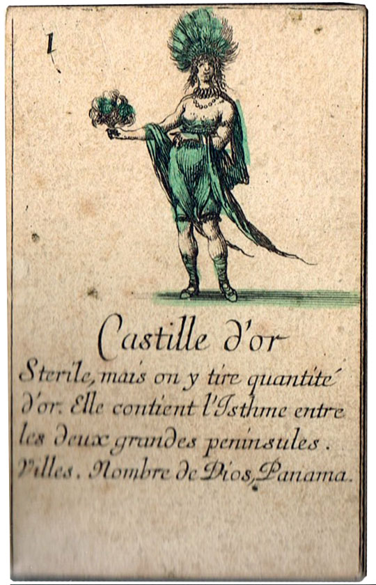 Each card has on its upper half a design or figure in a national costume, emblematic of a geographical division of the globe. Below are the title and an account of the place represented. The supposition that these cards could be used for ordinary play is illusory. Their primary purpose is instructive.