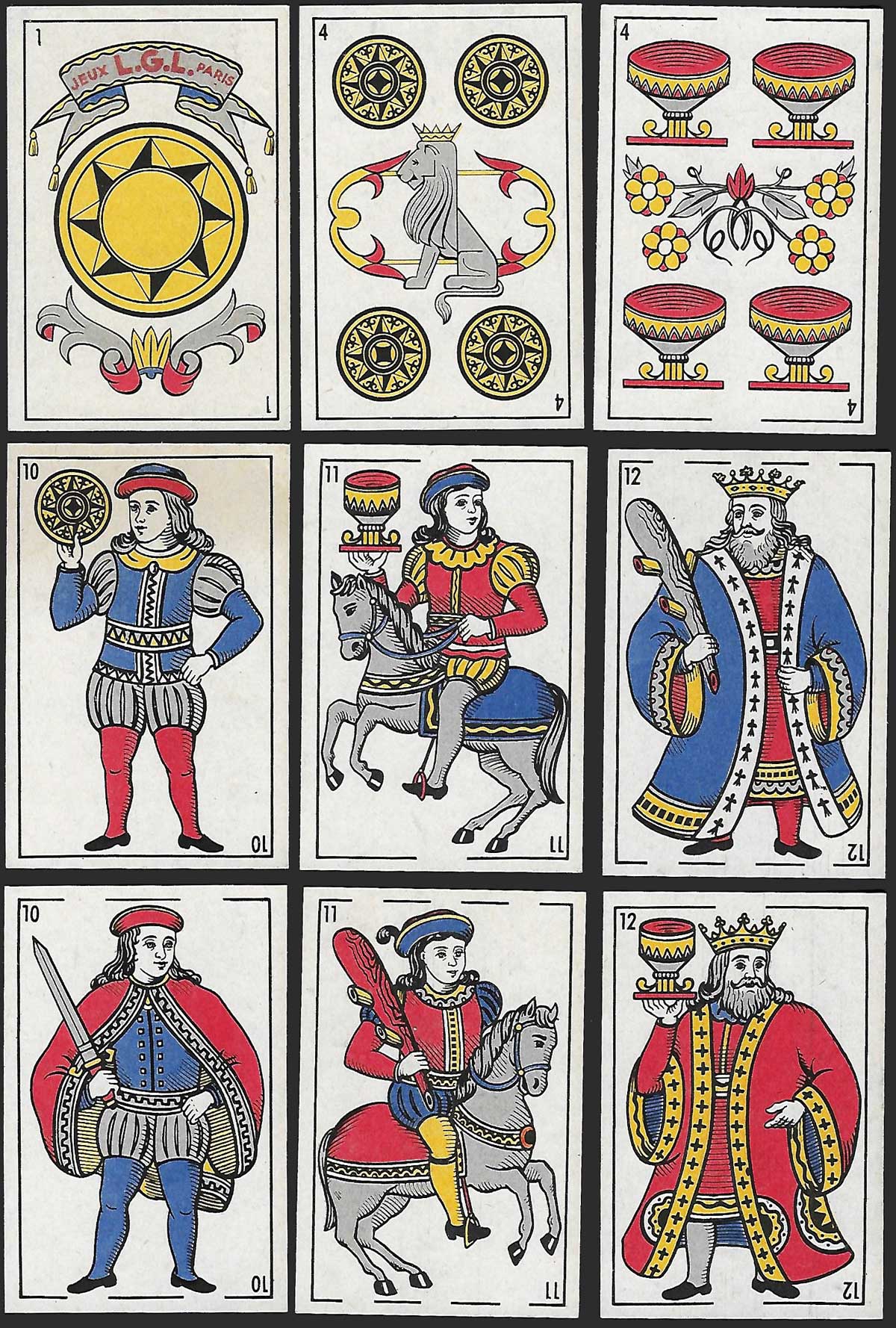 Above: alternative Spanish-suited pack by Jeux L.G.L. with square corners. The four of coins also features a crowned lion and the four kings are crowned with their calves showing, resembling the Spanish “Parisian” pattern. From the collection of Enrique García Martín.
