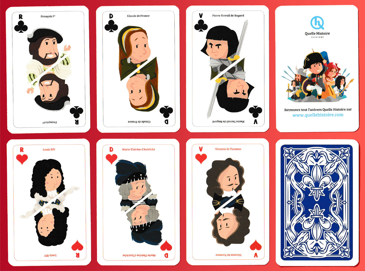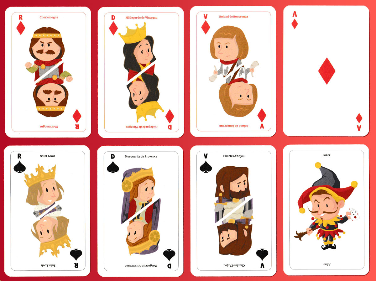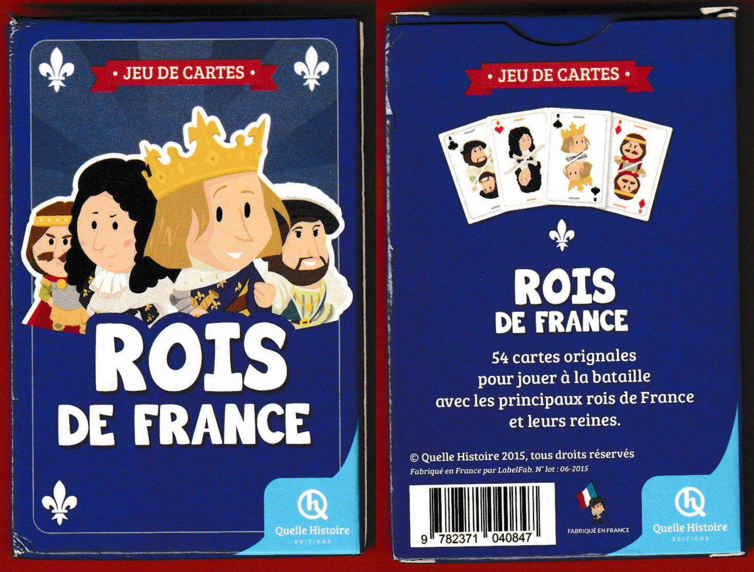 Above: Rois de France educational playing cards for younger audience, published by Quelle Histoire and made in France by LabelFab, 2015. 52 cards + 2 (identical) Jokers + 1 extra card in tuck box. Size: 55 x 84 mm.