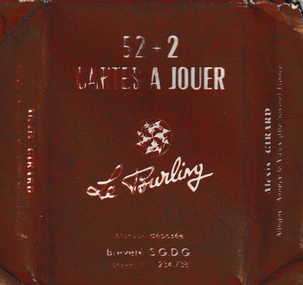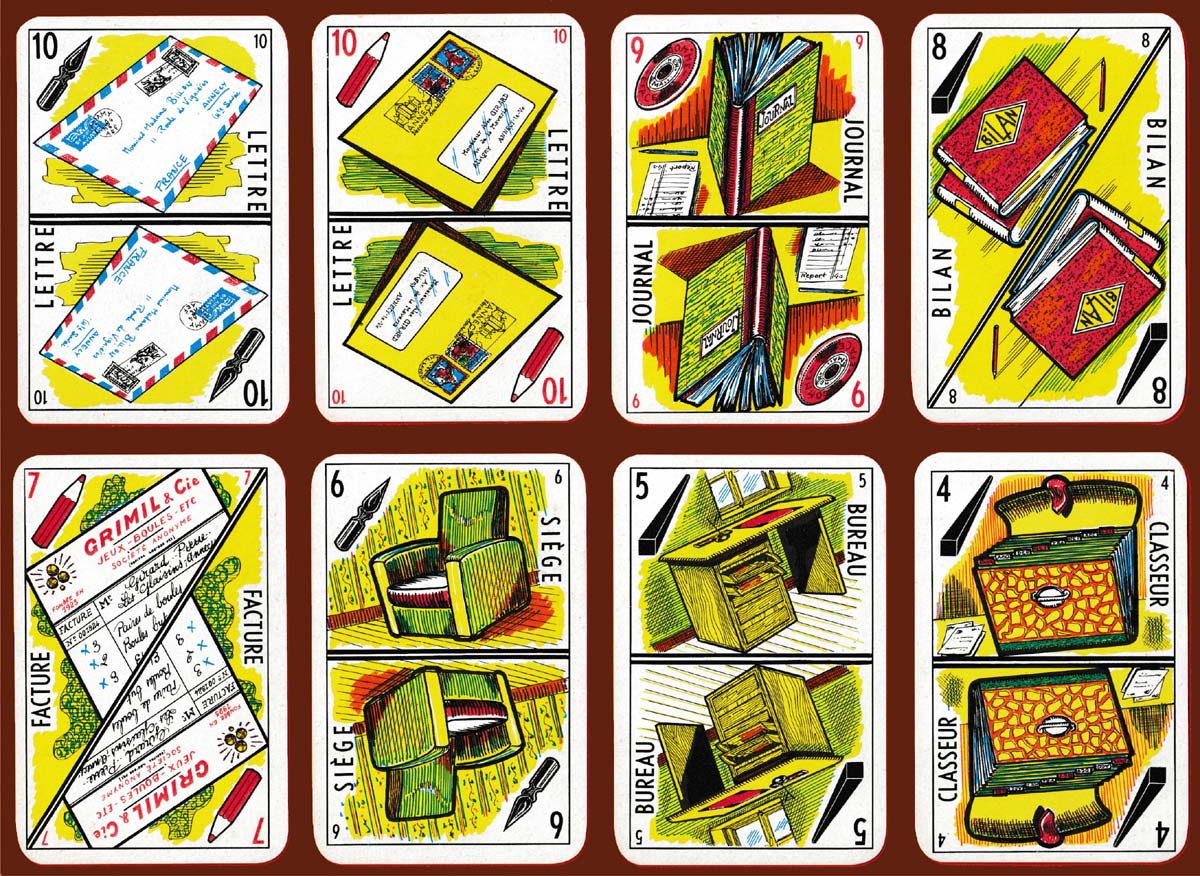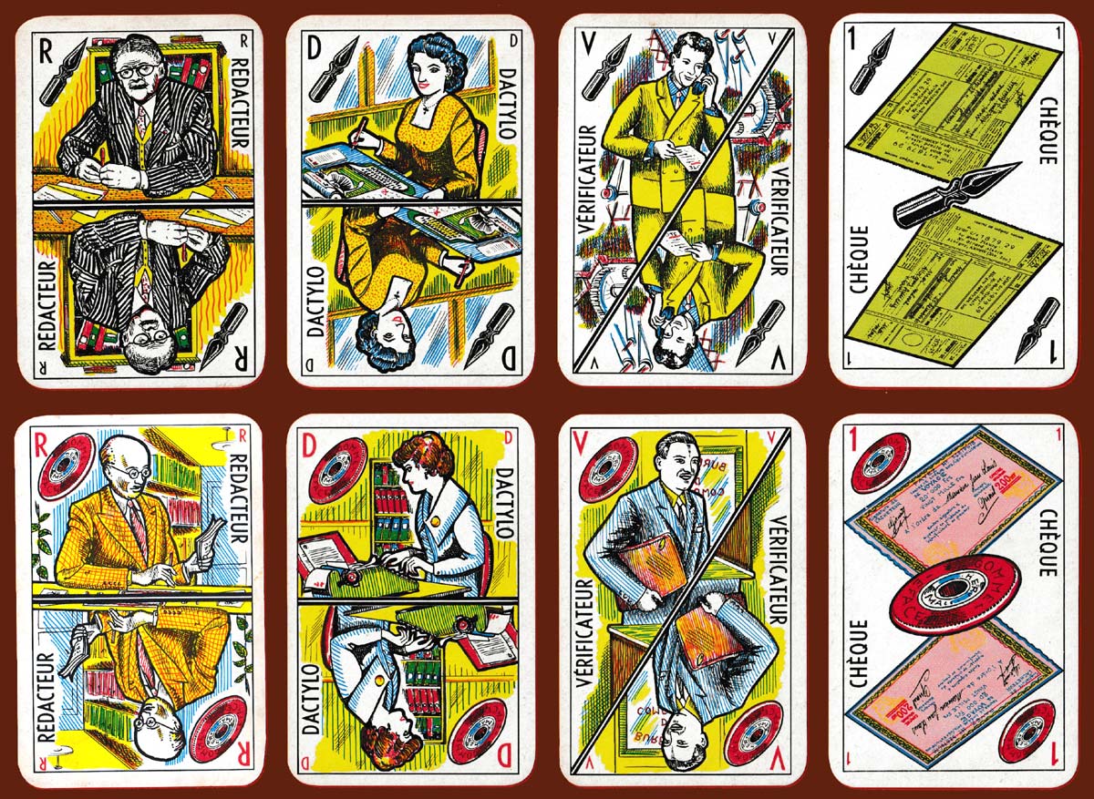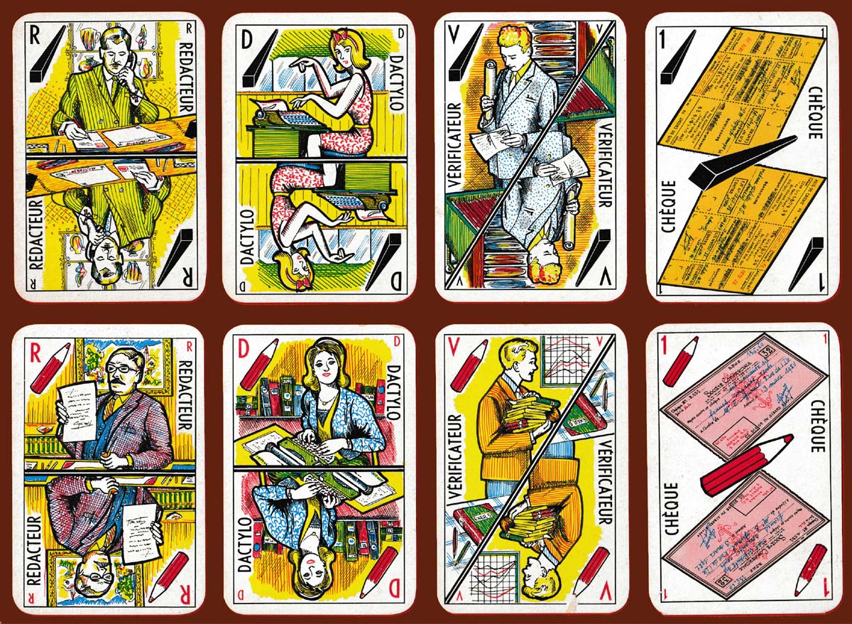 In French, le burlingue is a popular name for the office. It may be, therefore, that “Le Burling” is simply an alternative spelling. That would make sense given the subject matter and the non-standard suits in this unusual and original pack. The two red suits are pencils and rubbers (erasers), while the two black suits are rules and pen nibs, reminiscent of copper-plate penmanship neatly entered into ledger books. Each of the 54 cards has a different, double-ended design, some being divided horizontally and some diagonally. The Aces are cheques, the Kings editors, the Queens typists, the Jacks auditors/inspectors, the 10s letters, the 7s invoices, the 5s desks, the 4s filing systems, all from before the advent of office automation. The Jokers are temporary workers. The back design comes in blue or brown, with a matching paper wrapper►