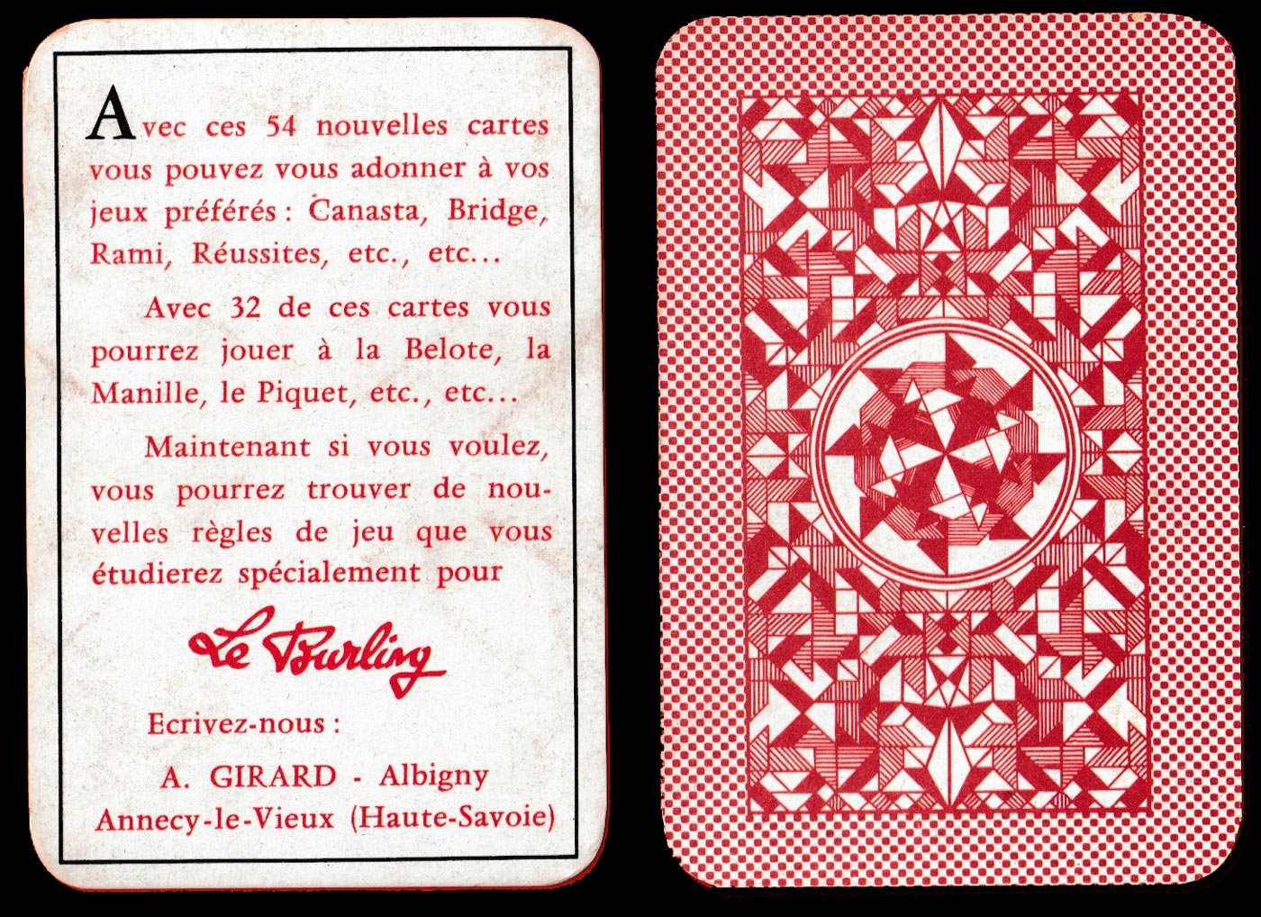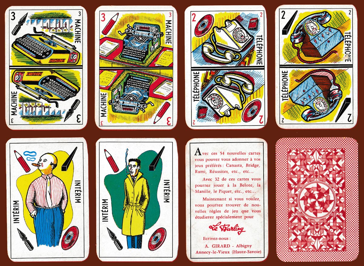 Above: ‘Le Burling’ office-themed playing cards created by Alexis Girard, Albigny, Annecy-le-Vieux (Haute-Savoie), France, c1962. 52 cards + 2 Jokers + 1 extra card in paper wrapper. Size: 57 x 85 mm.