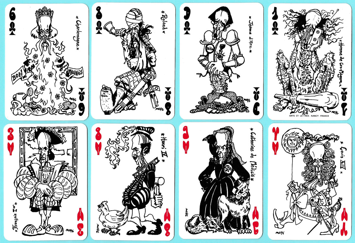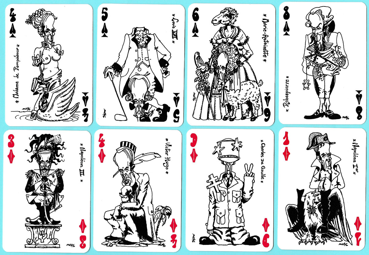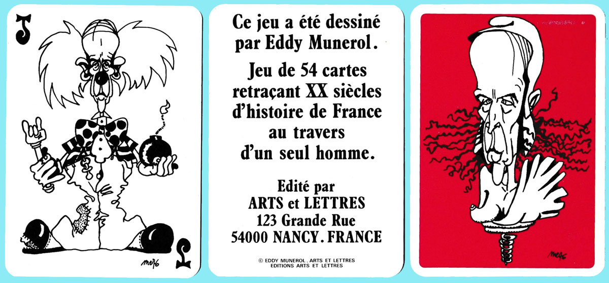 Designed by Eddy Munerol and published in 1976 by Editions Arts et Lettres, Nancy, this pack is subtitled “XX siecles d’histoire de France au travers d’un seul homme, en 54 cartes a jouer” (“20 centuries of French history through a single man, in 54 playing cards”). It features biting, satirical images of former French President Valery Giscard d’Estaing (1926-2020), in the guises of the great men and women of French history (e.g. Napoleon III, Catherine de’ Medici, Madame de Pompadour, Louis XVI, Marie-Antoinette). Although the subtitle refers to 54 cards, the pack consists of 52 cards, plus 3 Jokers, plus an extra information card.