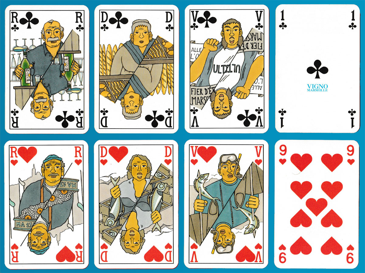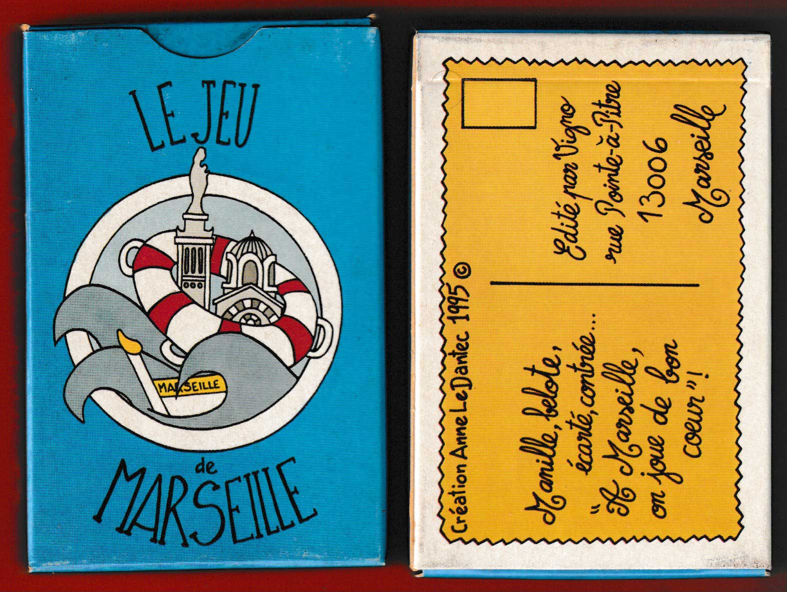 Above: ‘Le Jeu de Marseille’ created by Anne Le Dantec. Printed and published by Vigno, Marseille, France, 1995. 52 cards + 2 (identical) Jokers in tuck box. Size: 58 x 89 mm.