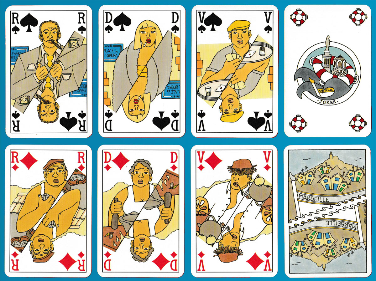 Marseille, France’s oldest city, has the reputation of being both rough and friendly. These two aspects are admirably captured by Anne Le Dantec in her designs for the court cards and Joker(s) in this pack. These are just the kind of characters you might meet on a stroll through the city, in a bar or down by the port. Pastis, fish, smoking and card playing are much in evidence. The indices are in French. The back design is made up of the prow of a boat, some colourful houses (or beach huts?), and the silhouette of Notre-Dame de la Garde. See the box►