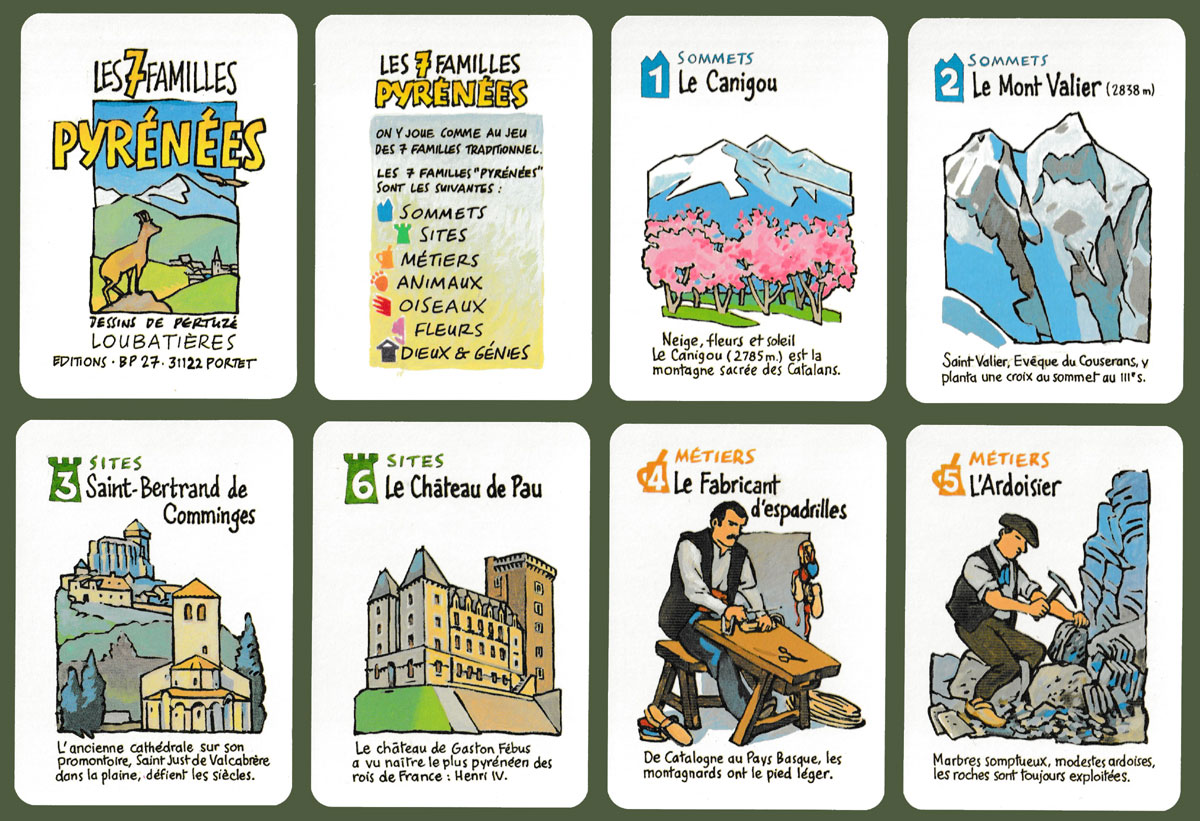 Forming the border between France and Spain, the Pyrenees have much to offer the visitor – unusual flowers and animals, castles and cathedrals, snowy peaks and myths galore. These were the inspiration for Pertuzé’s designs in this traditional card game. Each set of 6 cards is identified by a different symbol and a different colour. A short caption in French describes each image. The artist, Jean-Claude Pertuzé (1949-2020), was a graphic designer, illustrator and author of comic books. His main interests were the traditions and history of Gascony and the Pyrenees. His images deliver a clear message in a straightforward and informative way. See the box►