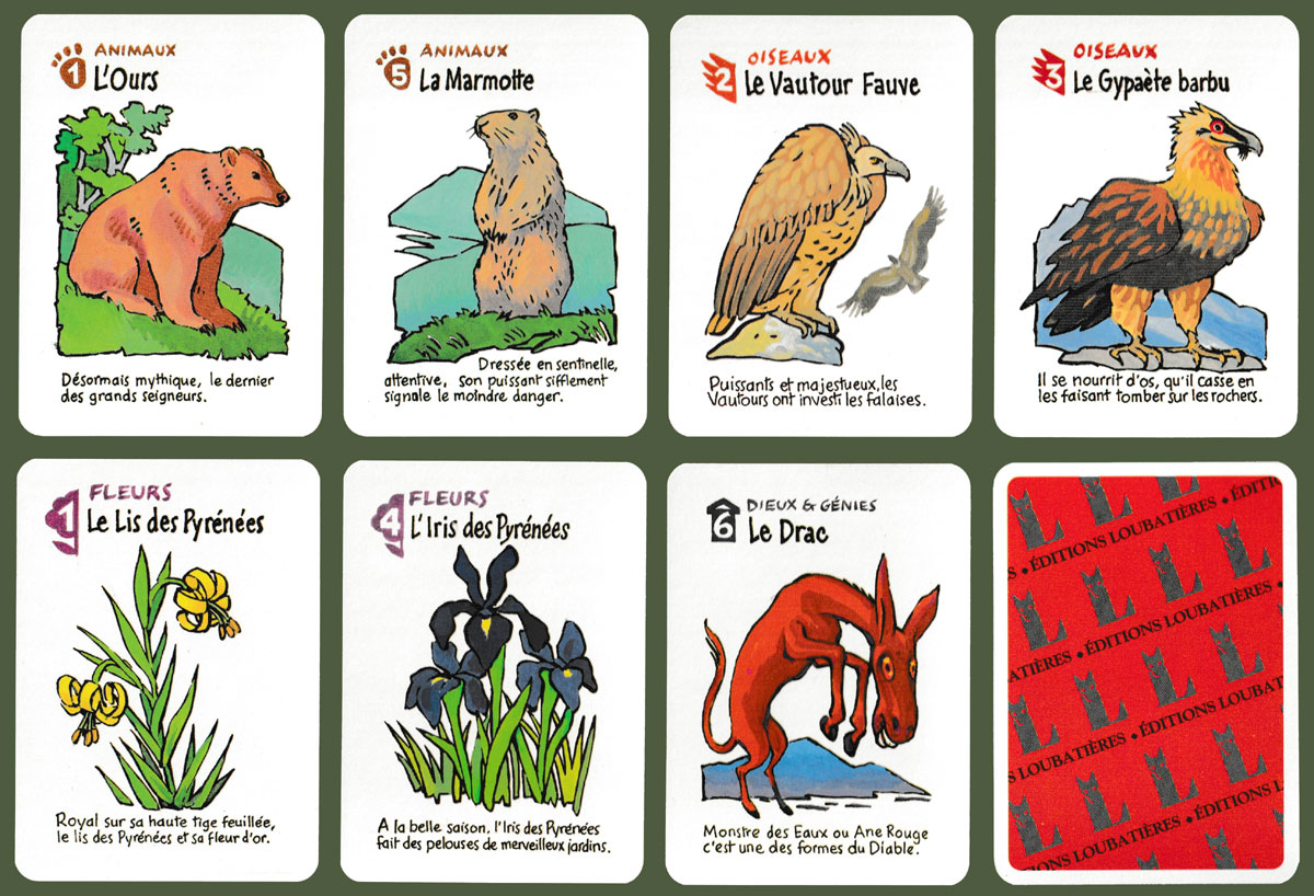 Above: Les 7 Familles Pyrénées printed by Vigno, Marseille, for Editions Loubatières, Portet, France, c1995. 42 cards + 2 extra cards in tuck box. Size: 63 x 88 mm.