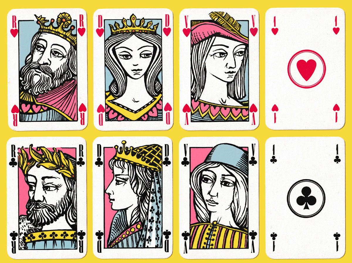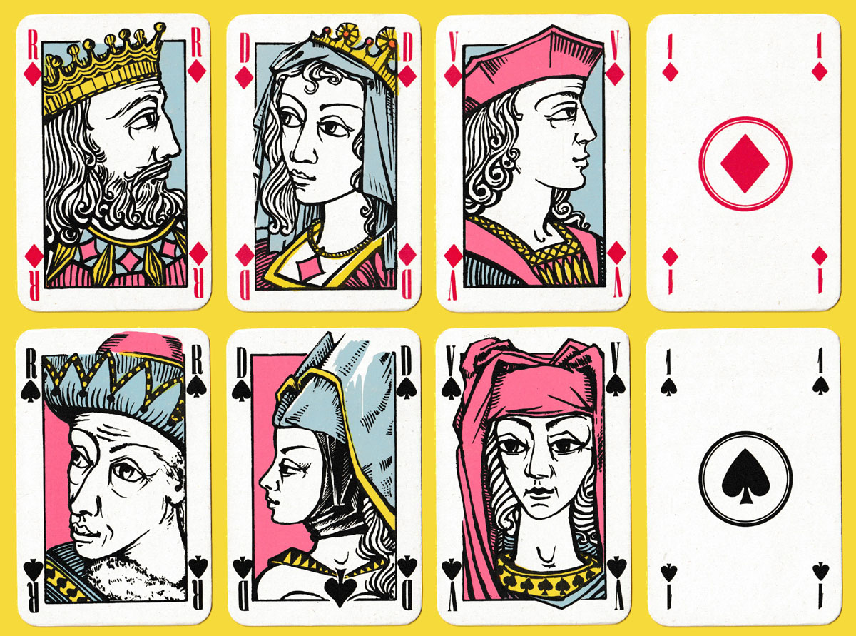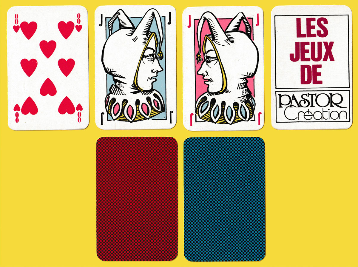 Although this pack is often called Le Jeu des Têtes (The Game of Heads), that name appears nowhere on the box or on the cards. The designs by Edouard Pastor (1932-2007) are based partly on the heads of the court cards in his earlier set, Le Jeu des Personnages de l’Antiquité et du Moyen-Age, although there are substantial differences, notably in the suit of diamonds whose courts appear to resemble those of the standard French pattern. The colours used are unusual – light blue, pink and yellow – with the faces of the courts remaining uncoloured. The back design is composed of a pattern of small black dots on a blue or red ground. The cards have gilt edges. See the box