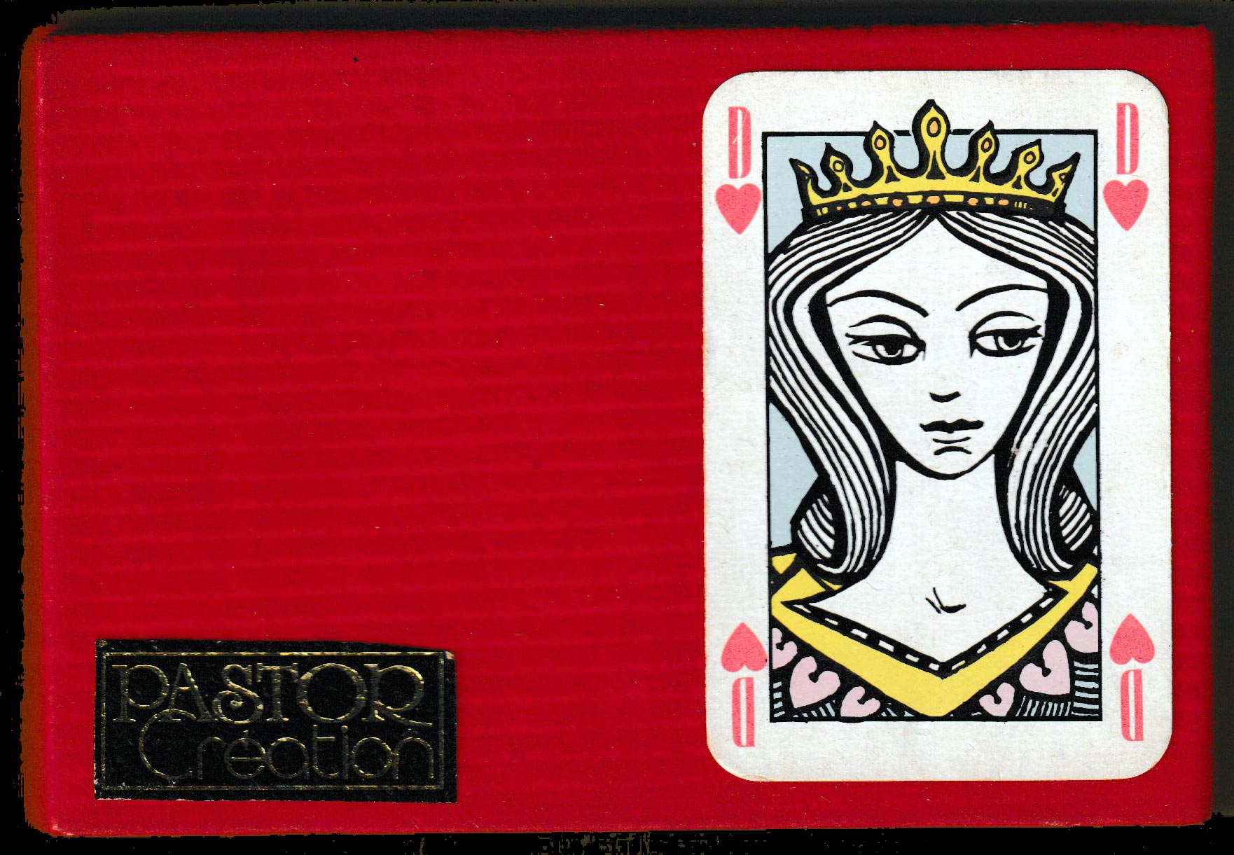Above: Les Jeux de Pastor designed by Edouard Pastor, France, 1972. Printer unknown. 2 x 52 cards + 2 Jokers, + 1 extra card in double red box with pull-out drawer. Size: 56 x 86 mm.