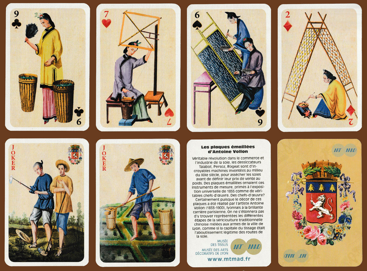 Lyon has long been associated with the manufacture of silk. In the middle of the 19th century, new machines (‘dessiccateurs’) were invented for drying silk. Decorating the machines were beautiful enamel plaques by the Lyon-born artist Antoine Vollon (1833-1900). Amazingly, he was only 20 or 21 when this series of curved plaques was created. He went on to find fame and fortune as an artist in Paris. The 54 different designs in this pack cover all stages of the production of silk and provide a fascinating record of an ancient craft industry. The old coat of arms of Lyon is featured on the reverse, surrounded by a garland of flowers. See the box