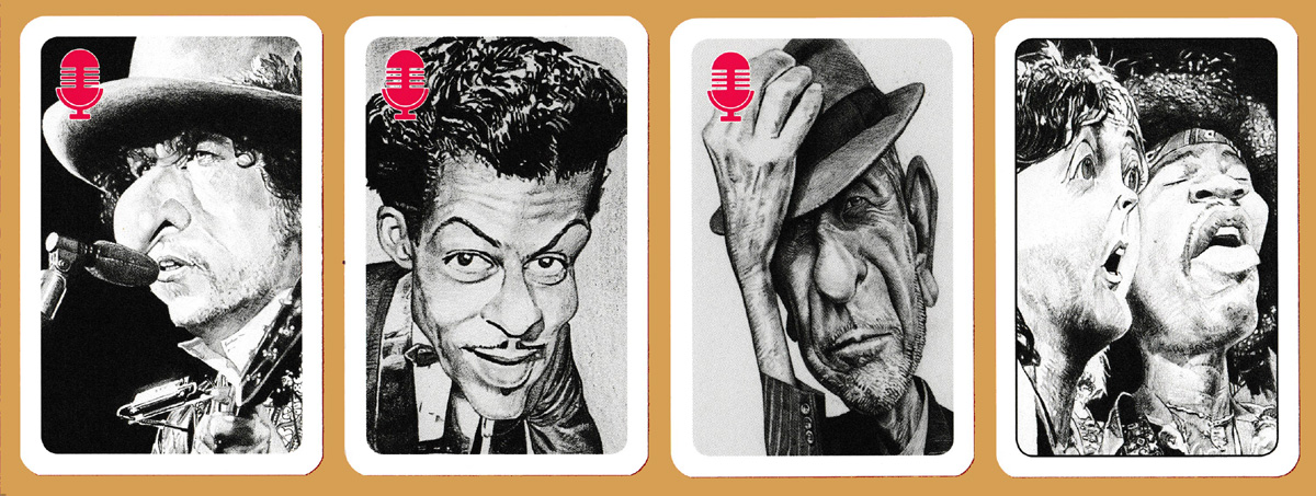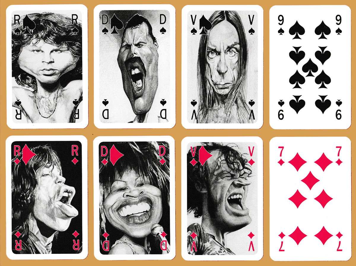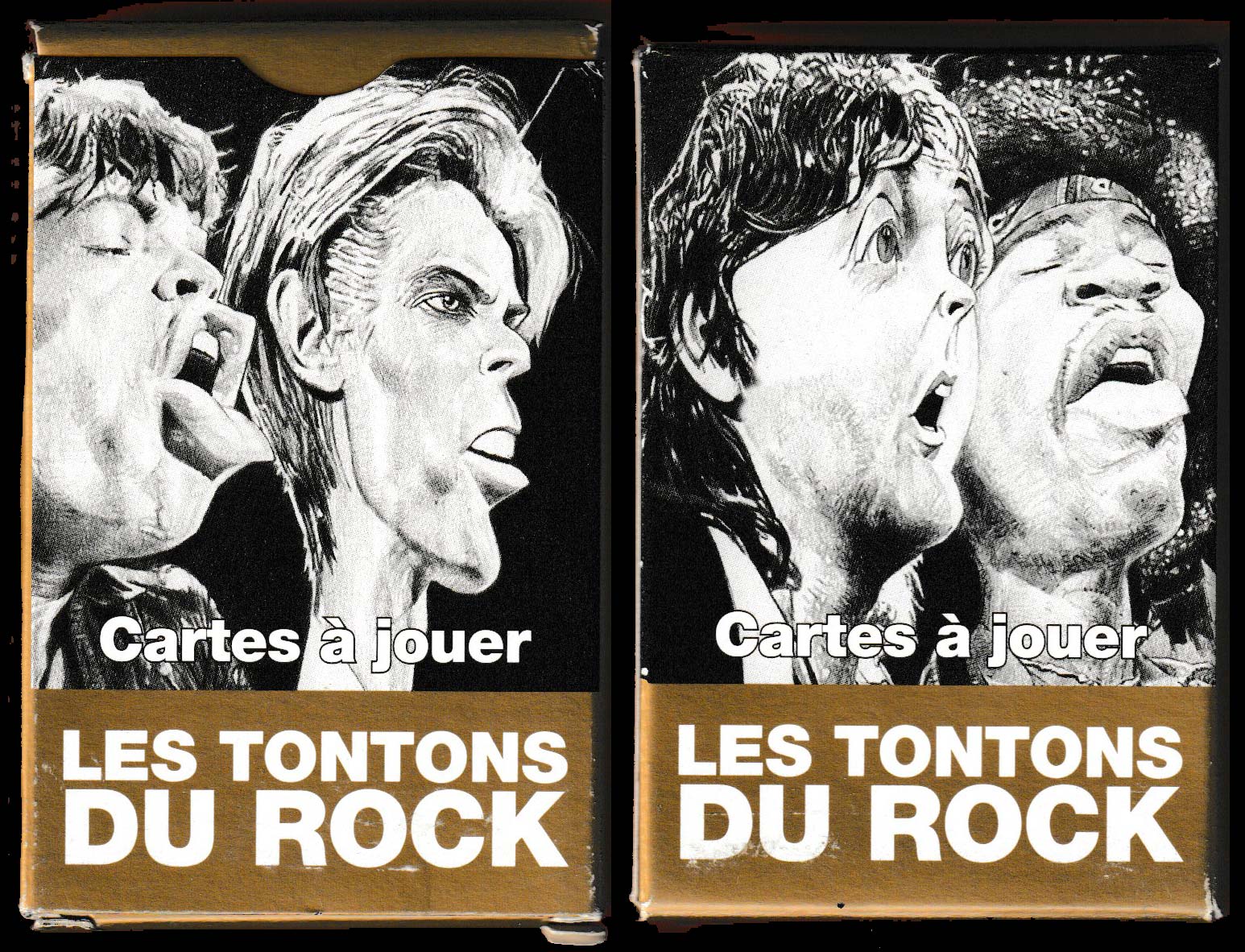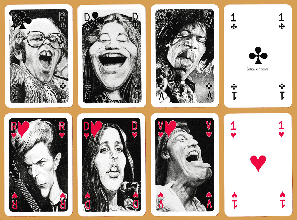 In French, ‘tonton’ is a term of affection, most often used by a child when referring to an uncle. Here, the 15 ‘tontons’ are all rock and pop stars. The head and shoulders portraits in black and white are ‘full-on’ and ‘in-your-face’! Though not named, most are easily recognisable including Mick Jagger (KD), David Bowie (KH), Freddy Mercury (QS) and Tina Turner (QD). The indices are in French. A red microphone is included in the top left-hand corner of each of the Jokers. Paul McCartney and Jimi Hendrix are on the reverse.