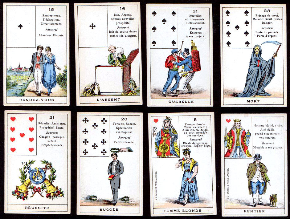 Above: Livre du Destin or Book of Fate with titles in French and English, published by Chartier-Marteau & Boudin and printed by B.P.Grimaud, Paris, c.1900. 32 cards. The tax stamp is dated Apr 12, 1890. Images courtesy Gilles Daigle. Download entire deck as large size images here →.