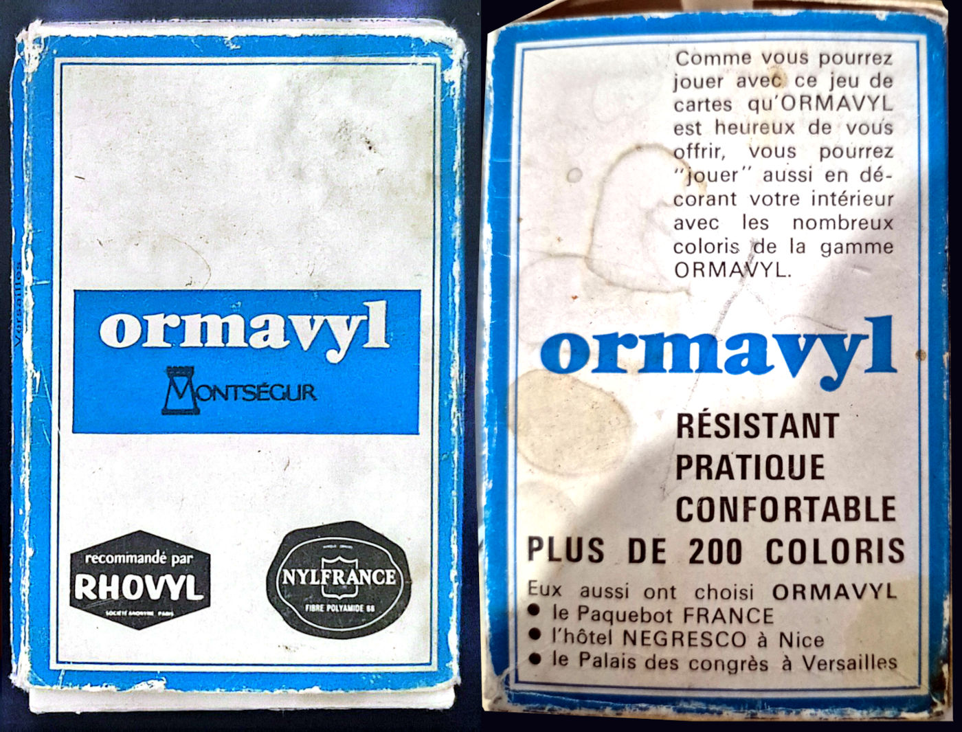 Above: Ormavyl advertising playing cards published by Synergie, made in France, 1970s. 52 cards + 2 jokers + extra card in box.