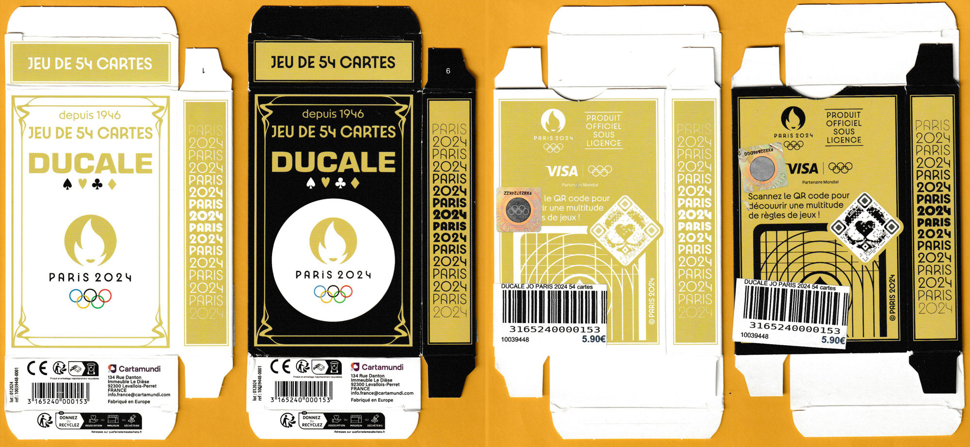Above: Paris 2024 Olympics playing cards published by Cartamundi under the “Ducale” label, 2024. Made in Europe. 52 cards + 2 Jokers + 1 extra card in tuck box. Size: 55 x 84 mm. © PARIS 2024