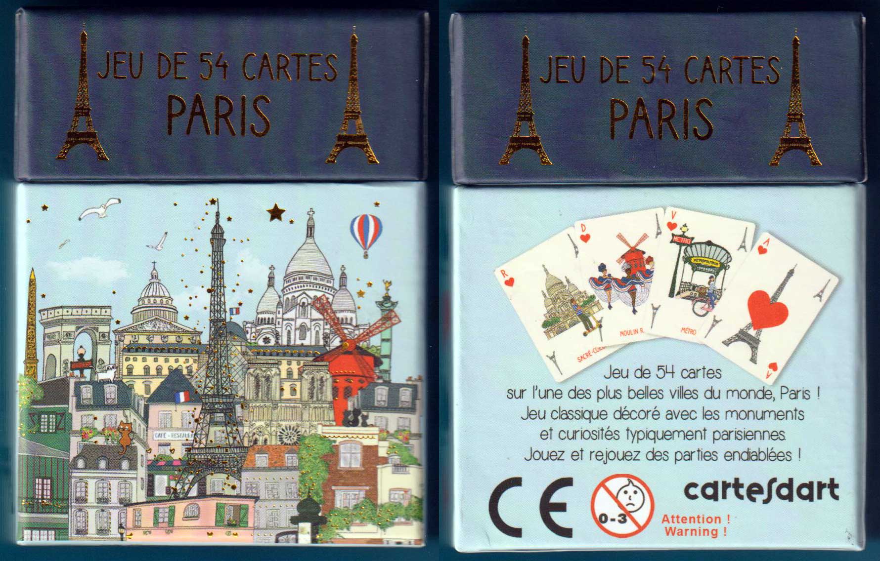 Above: Paris Souvenir playing cards published by Editions Cartes d’Art, Paris, France. Made in China. 52 cards + 2 (identical) Jokers in rigid box. Size: 63 x 88 mm. Amélie LAFFAITEUR © EDITIONS CARTES D’ART. Purchased in Paris, August 2025.