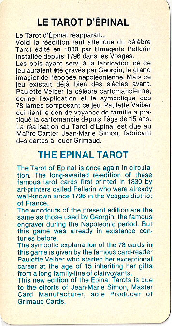 The Épinal tarot cards are believed to have been first published in 1830 by the art printers Pellerin & Cie, who were established in the Vosges district of France since 1796 producing card games, religious prints and other imagery, all inexpensively printed for popular distribution. The cards were in production until the 1870s. They have been reproduced more recently in several re-prints, including the edition shown here.