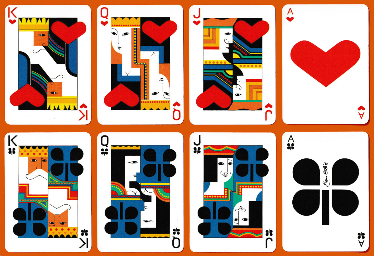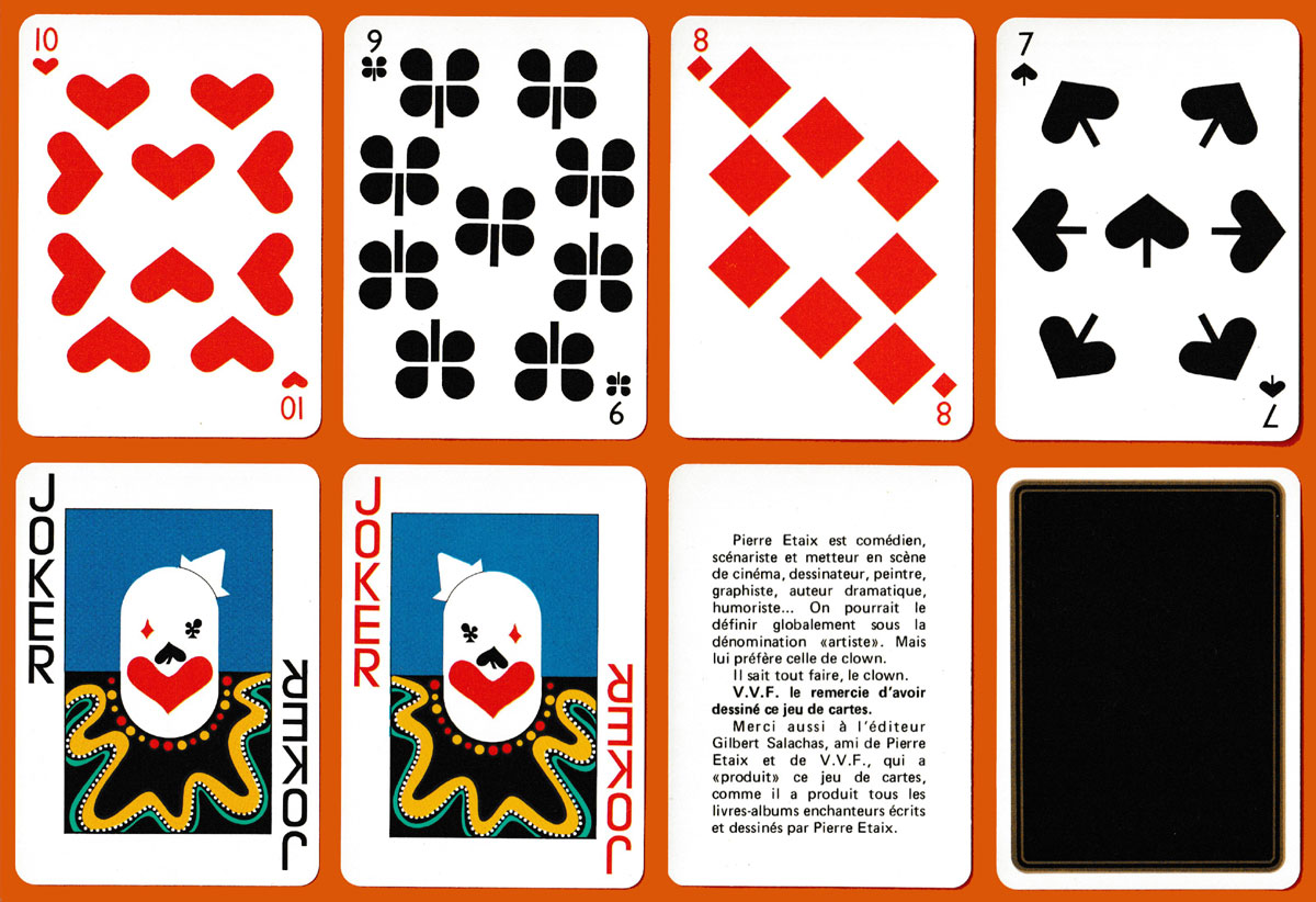 Pierre Etaix (1928-2016) was a French clown, comedian, writer, illustrator, director and filmmaker, but he trained first to be a graphic designer. He considered himself to be, above all, a clown, hence the designs on the two Jokers. Not only are the court card designs bold, original and colourful but the style and arrangement of the pips are striking as well. The artist’s signature appears on the Ace of Clubs. The back is plain black with a gold border. See the box►