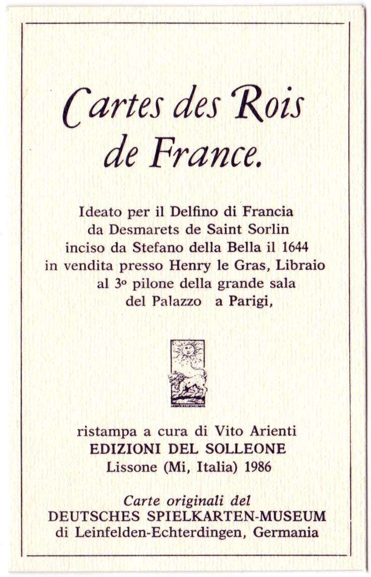 Cartes des Rois de France (1644) facsimile edition by Edizioni del Solleone, 1986.