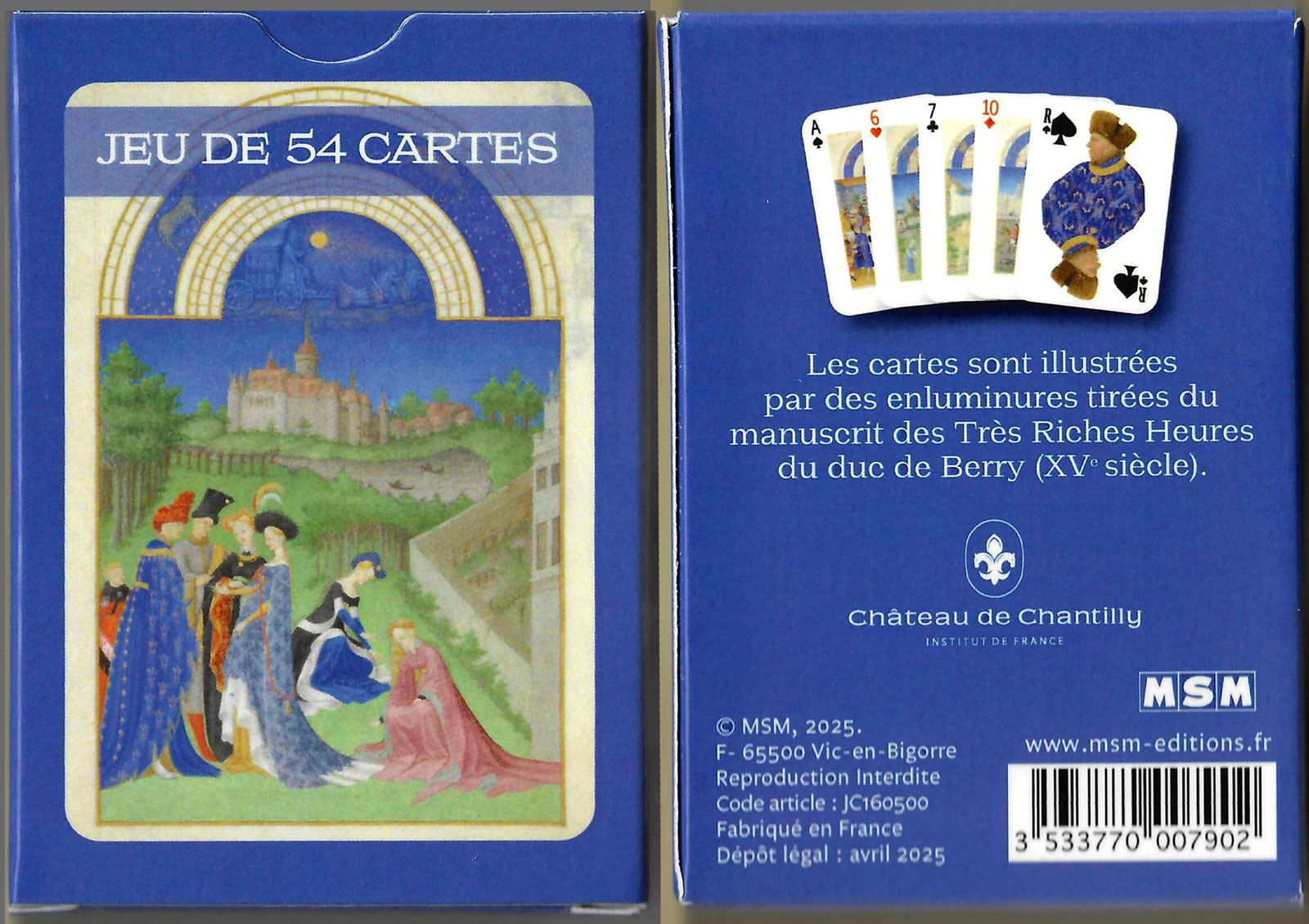 The book is housed in the Musée Condé, in the Château de Chantilly, Paris. This pack was published by MSM Editions in 2025 in conjunction with the exhibition held in the Musée Condé between 7 June and 5 October 2025. While the aces and pip cards repeat the same illumination across all four suits, the court cards differ in each suit. The Duc de Berry is portrayed on the ace and king of spades, and one might assume the remaining court cards represent family, household members or nobility portrayed in the illuminated pages - but unfortunately, there is no accompanying guide to enable identification. • See the box