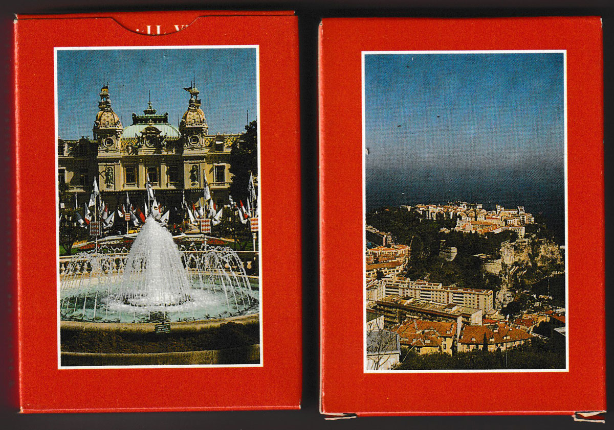 Above: Vues de Monaco-Monte Carlo souvenir playing cards printed and published by Edition Altapo-Vigno, Marseille, France, 1994. 52 cards + 2 Jokers + 1 extra publicity card in tuck box. Size: 63 x 88 mm.