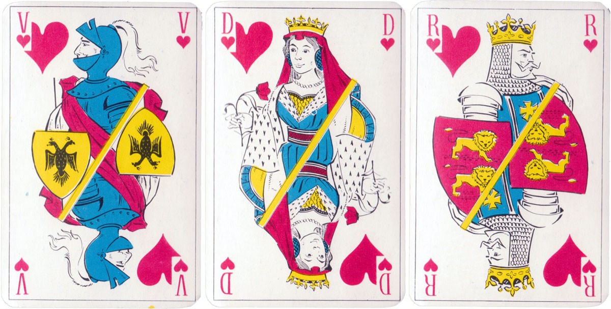 Above: “Jeu de Bataille” card game published by Éditions Willeb, Paris, ref no.1588. The back has a trellis pattern of blue crossed lines. Images courtesy Rex Pitts.