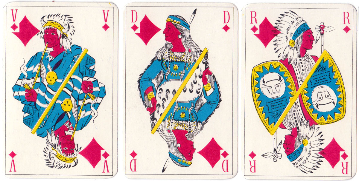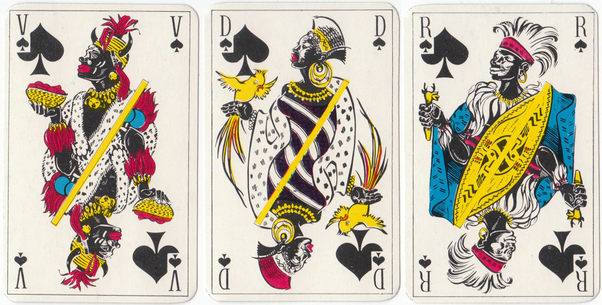 Jeu de Bataille card game published by Éditions Willeb, Paris, whose name appears on the ace of clubs. The non-standard court cards and numeral pips represent characters from different nationalities or ethnic groups who are presumably engaged in battle. These are : medieval European, native African, American Indian and Japanese. The cards are designed in the style of the French standard pattern with diagonal dividing lines between each end. Éditions Willeb, 13 Rue Marivaux, Paris, were book publishers since 1930s also published standard cards, tarots, children's card games, toys and puzzles.