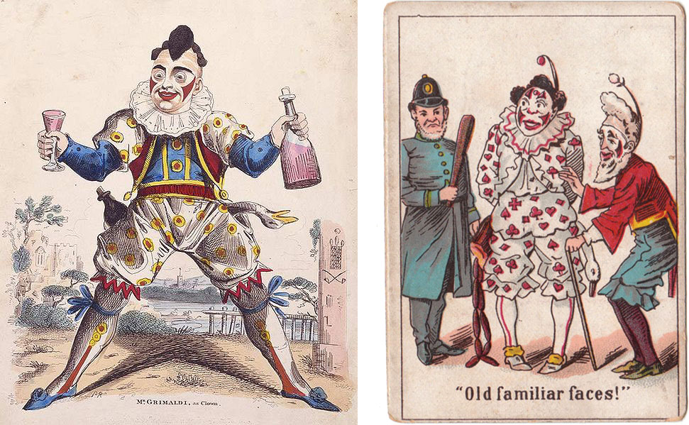 The “Old Familiar Faces” clown make-up is very much like that of the famous clown Joseph Grimaldi whose name “Joey” became used for all the subsequent white-faced clowns. Grimaldi had died in 1837 but his style of clown had become a permanent fixture in Victorian melodrama and pantomime.
