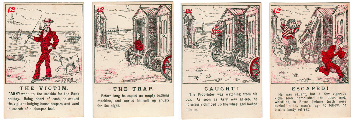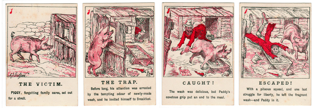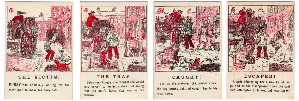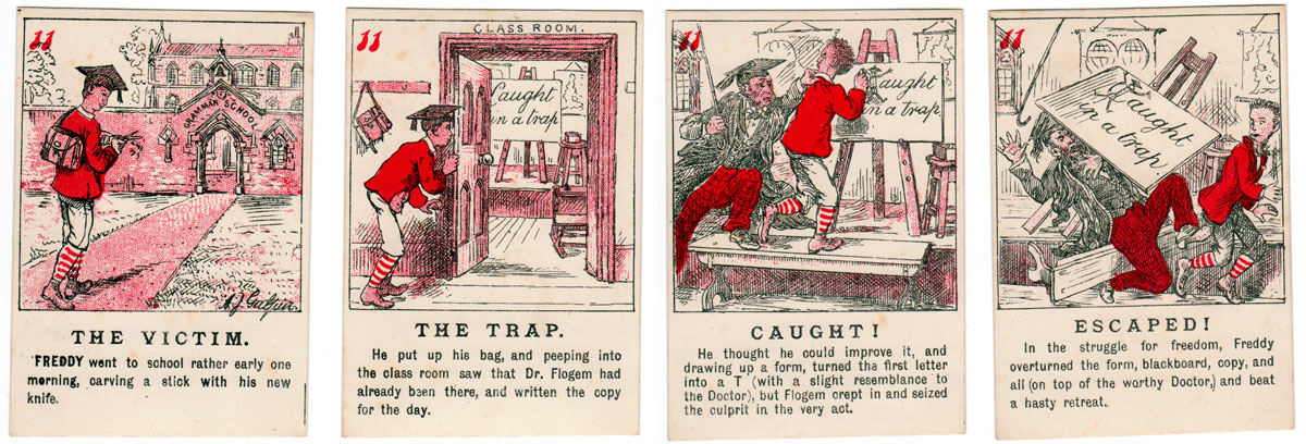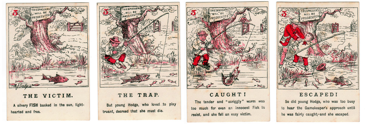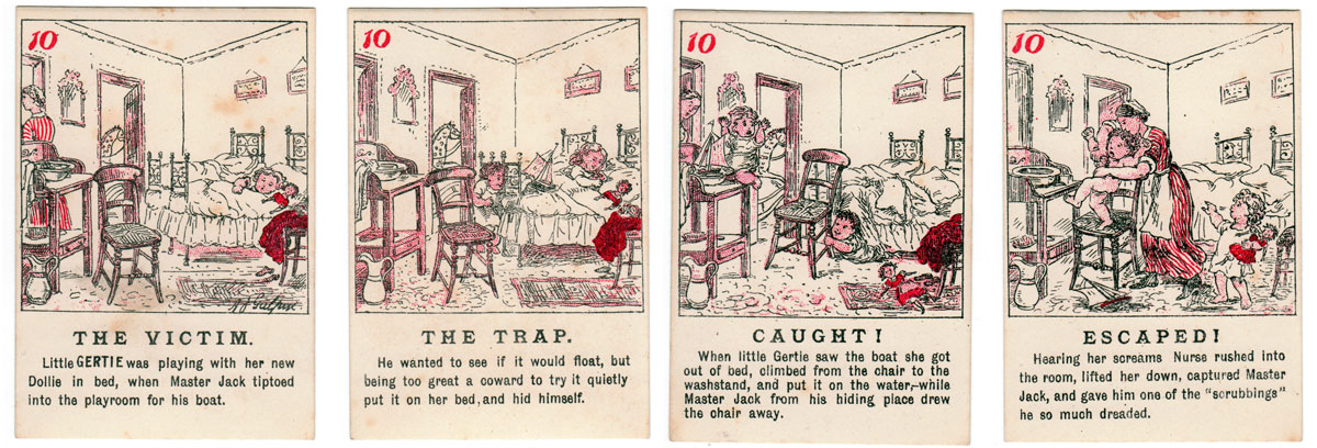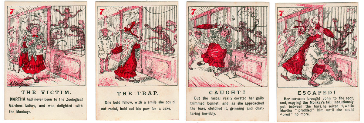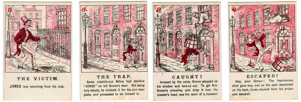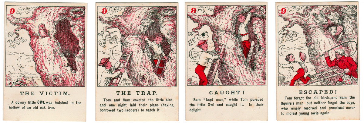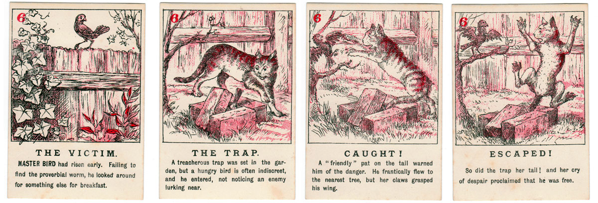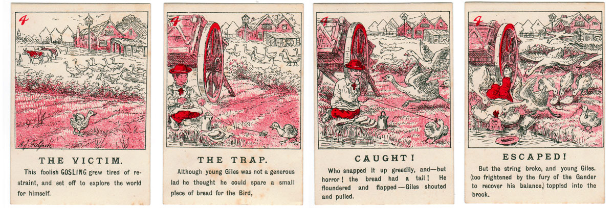A Victorian card game consisting of 12 sets of 4 cards, each set telling a story of a victim being ensnared in a trap, being caught, and finally escaping.