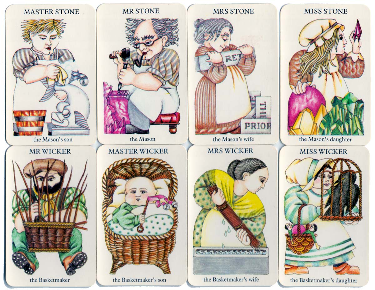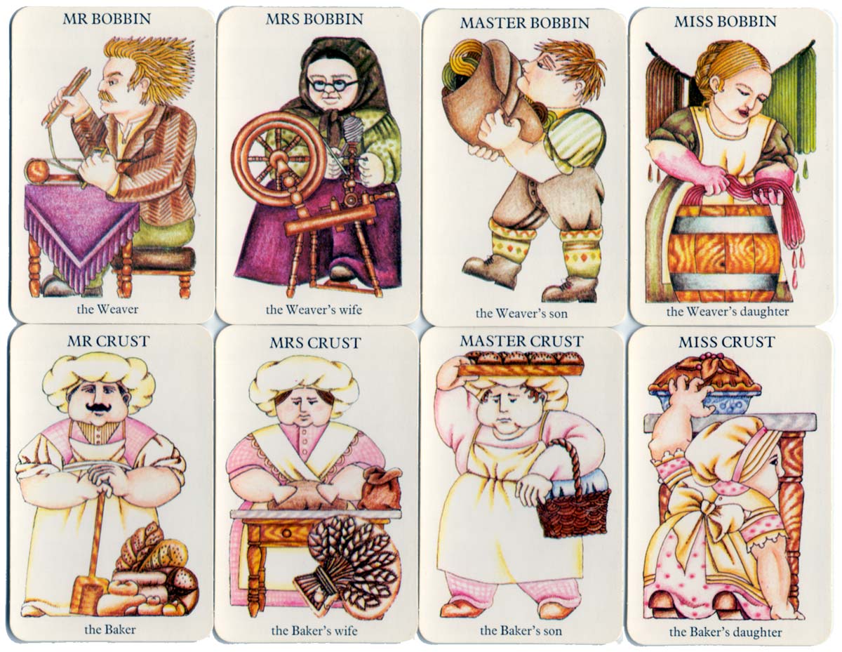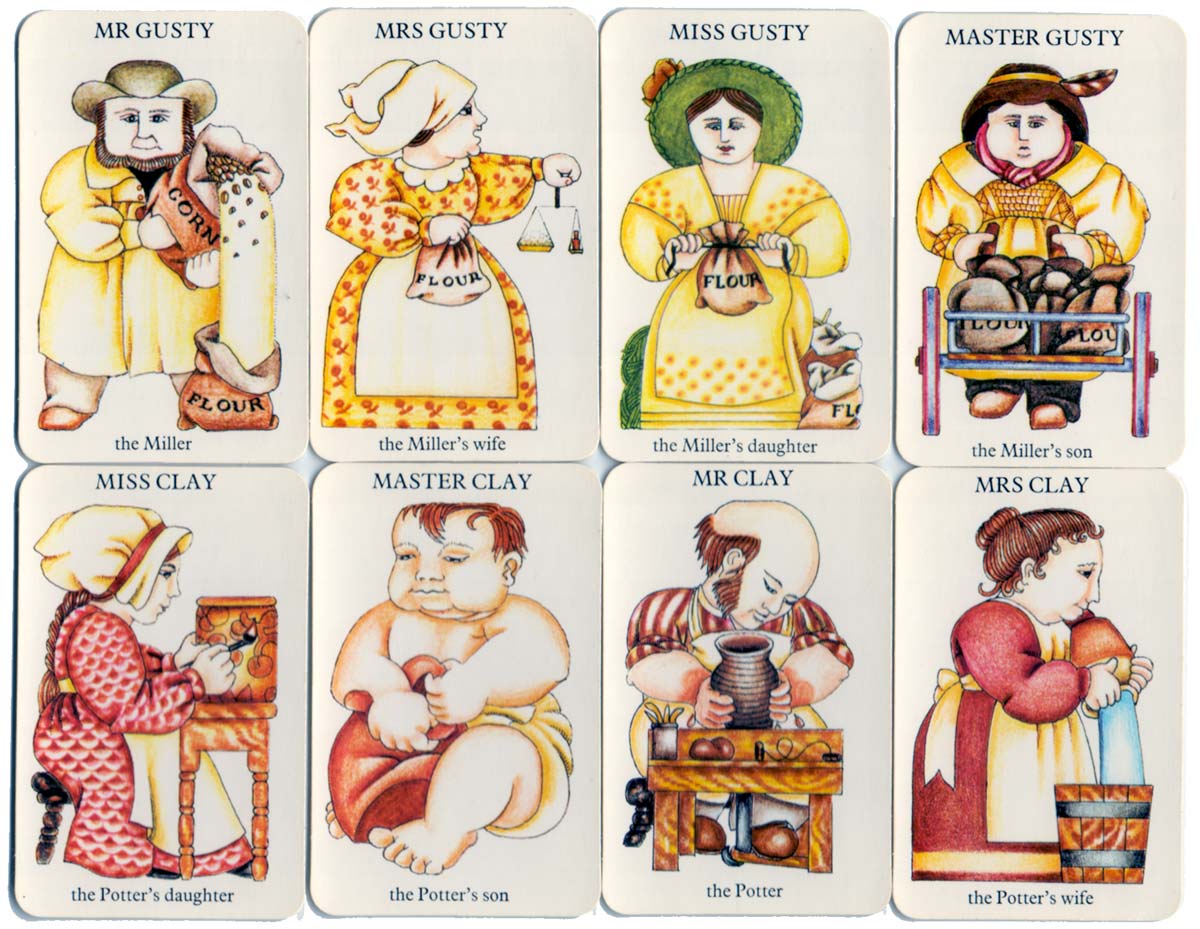 “Country Craftsmen” Happy Families illustrated by Mandy Hall, published for the National Trust by Dinosaur Publications Ltd, 1978. The 48 cards in the pack are grouped into 12 sets of four cards. Each set shows four members of a family, such as the Barley family or the Reed family, engaged in rural crafts such as farming and thatching. The object of the game is to collect as many complete families as possible.