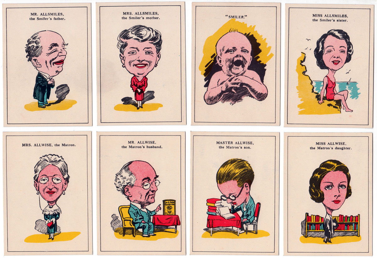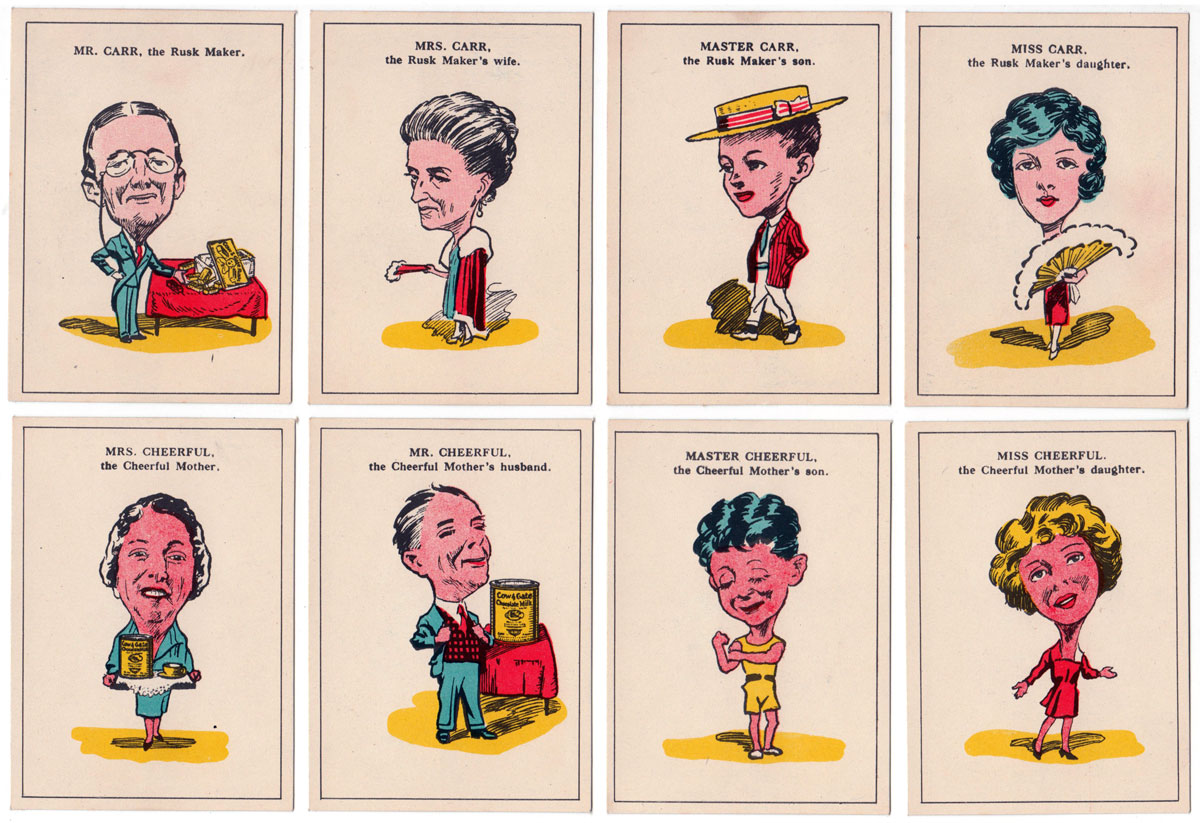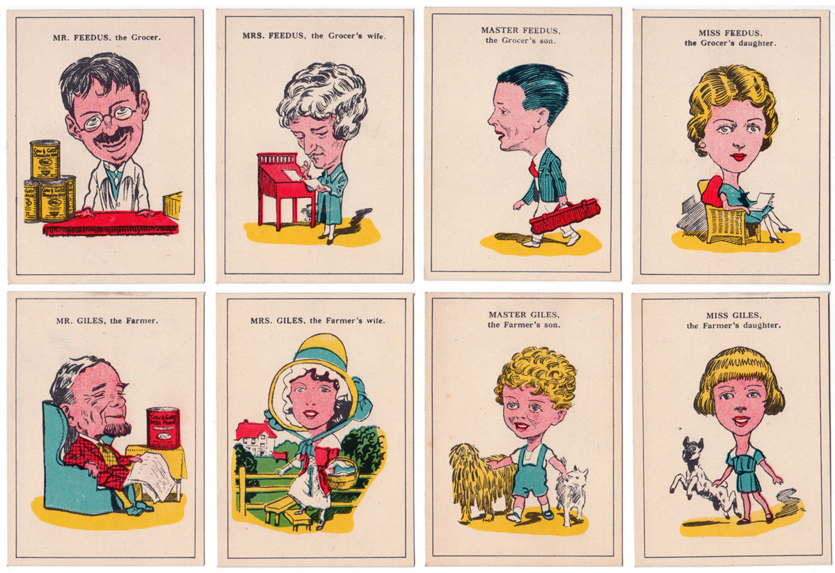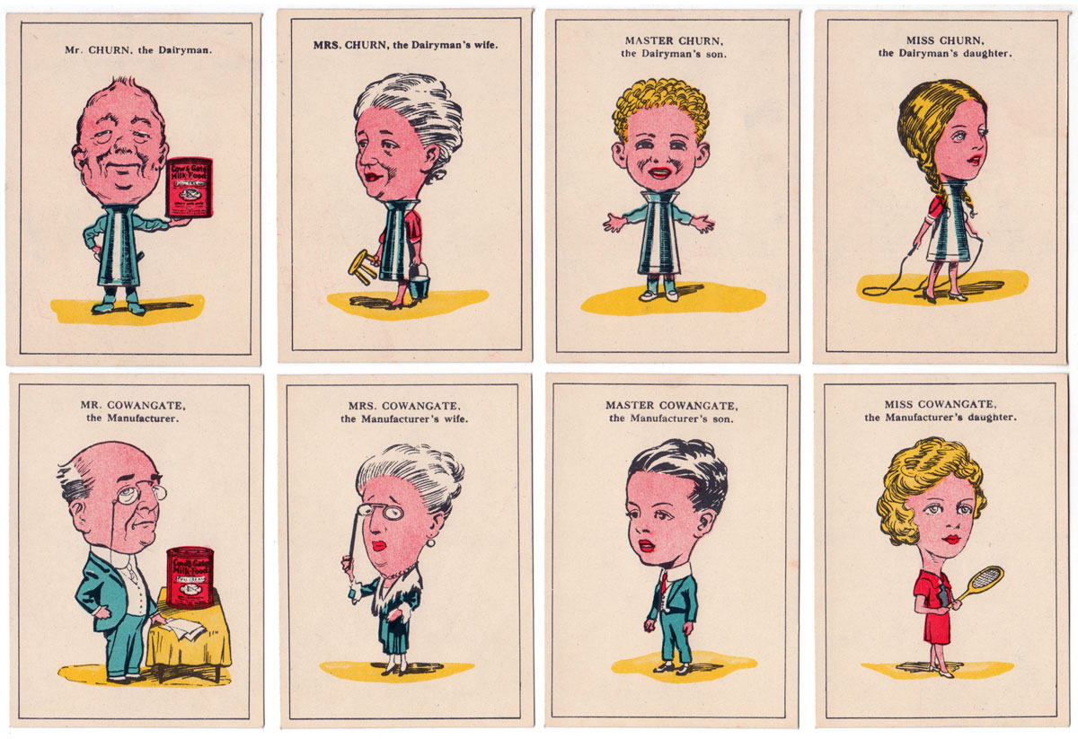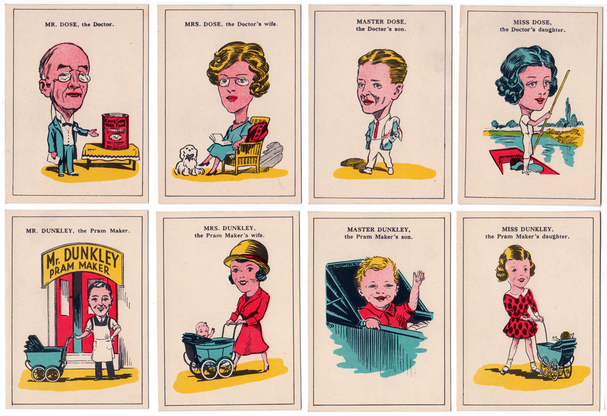 Cow and Gate Happy Family game was issued in 1928. The game comprises sets of four family members. Some of the family members also feature Cow & Gate nutrition products.