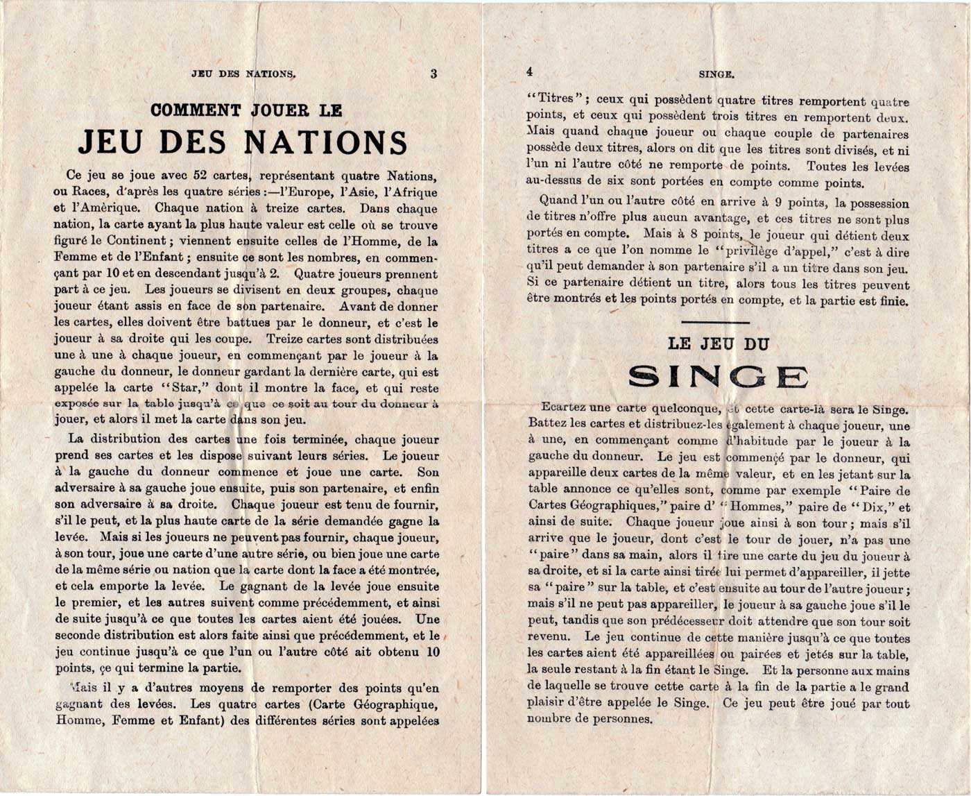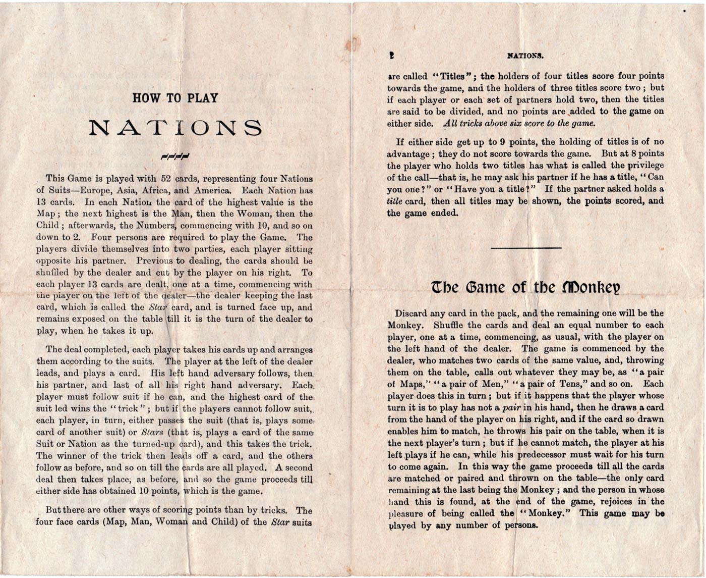 The “Game of Nations” is played with a 52-card deck divided into four suits representing Europe, Asia, Africa and America. These are in fact four continents rather than nations, inkeeping with other ‘Four Continent’ or Empire packs published around this time. Each ‘nation’ has 13 cards, with designs appropriate to the geographical region featured in that suit, running 2 → 10, Child, Woman, Man and Map (highest card). The court cards depict caricatures of people wearing traditional costumes from each of the four ‘nations’ in somewhat stereotyped style by today’s standards. See the Rules: English / French►