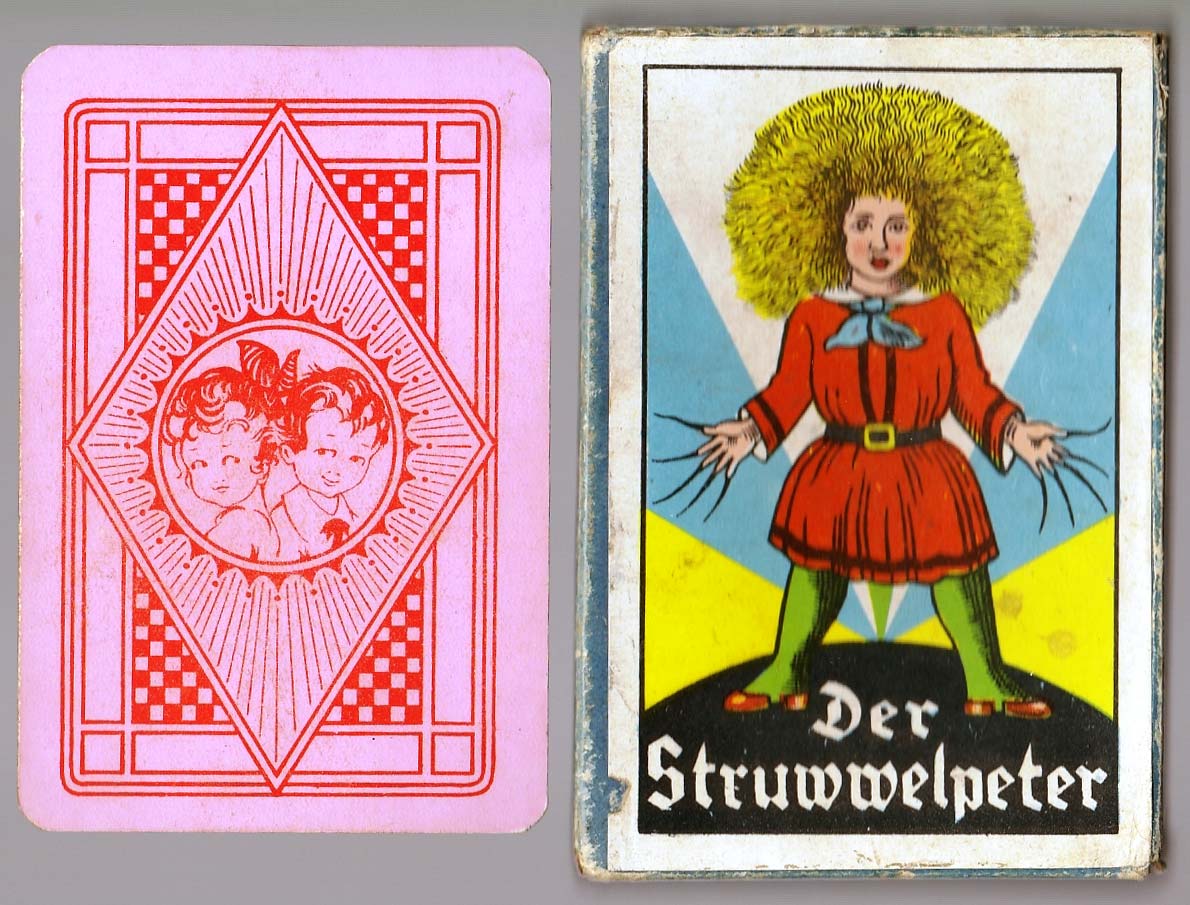 Above: box and 3 cards from a Struwwelpeter card game produced by Oppenheimer und Sulzbacher for German market.