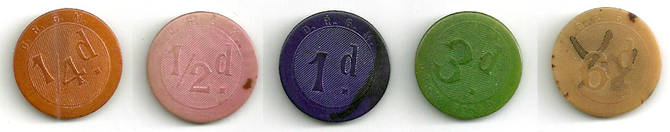 Above: the 'd' denomination for pence was distinctly British, until decimalisation in 1971. These tokens would likely have been used for English games requiring such tokens. One imagines they may have been part of a games compendium. Image courtesy Arthur Smith.