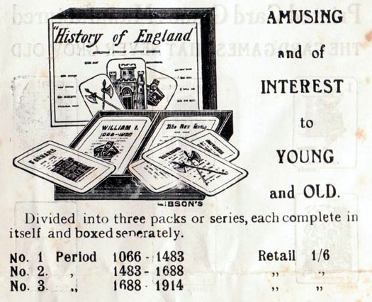 However, by the next time I have found it advertised the presentation has been given a considerable boost! The graphic is unchanged but it is now offered as “History without Tears!!!, a New and Attractive card game”, and the price has been boosted from 1/6 to 2/- a set. I would love to know how long it took Gibson’s to realise that they had a potential good seller on their hands which warranted both the heavier plug and the higher price.
