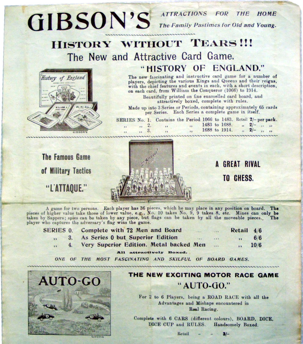 This second Gibson’s advert includes the game “L’attaque” which was itself a big seller for for the company and it appears to have survived for several decades. I remember playing it myself in the mid-1960s! Here it is described as “The famous game of Military Tactics” which implies that it has been around for a while, unlike “The History of England” and “Auto-Go” which are both described as “new”. In fact, L’attaque was patented in France on 26th November 1908 but Gibson’s only obtained the publishing rights to sell L'Attaque in English-speaking countries in 1925, keeping the original French name. So, we can conclude that if The History of England games were first produced in the 1920s it was towards the end of that decade.