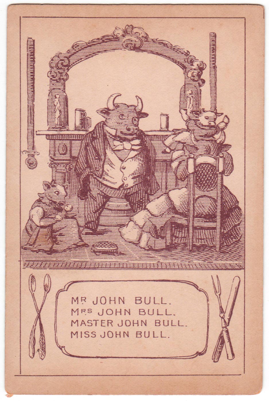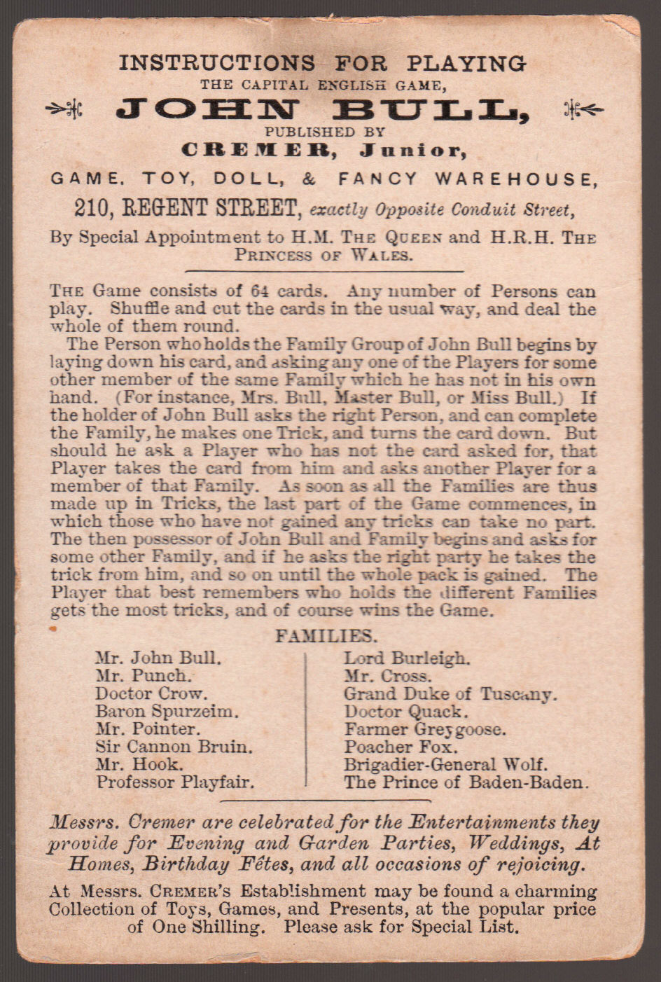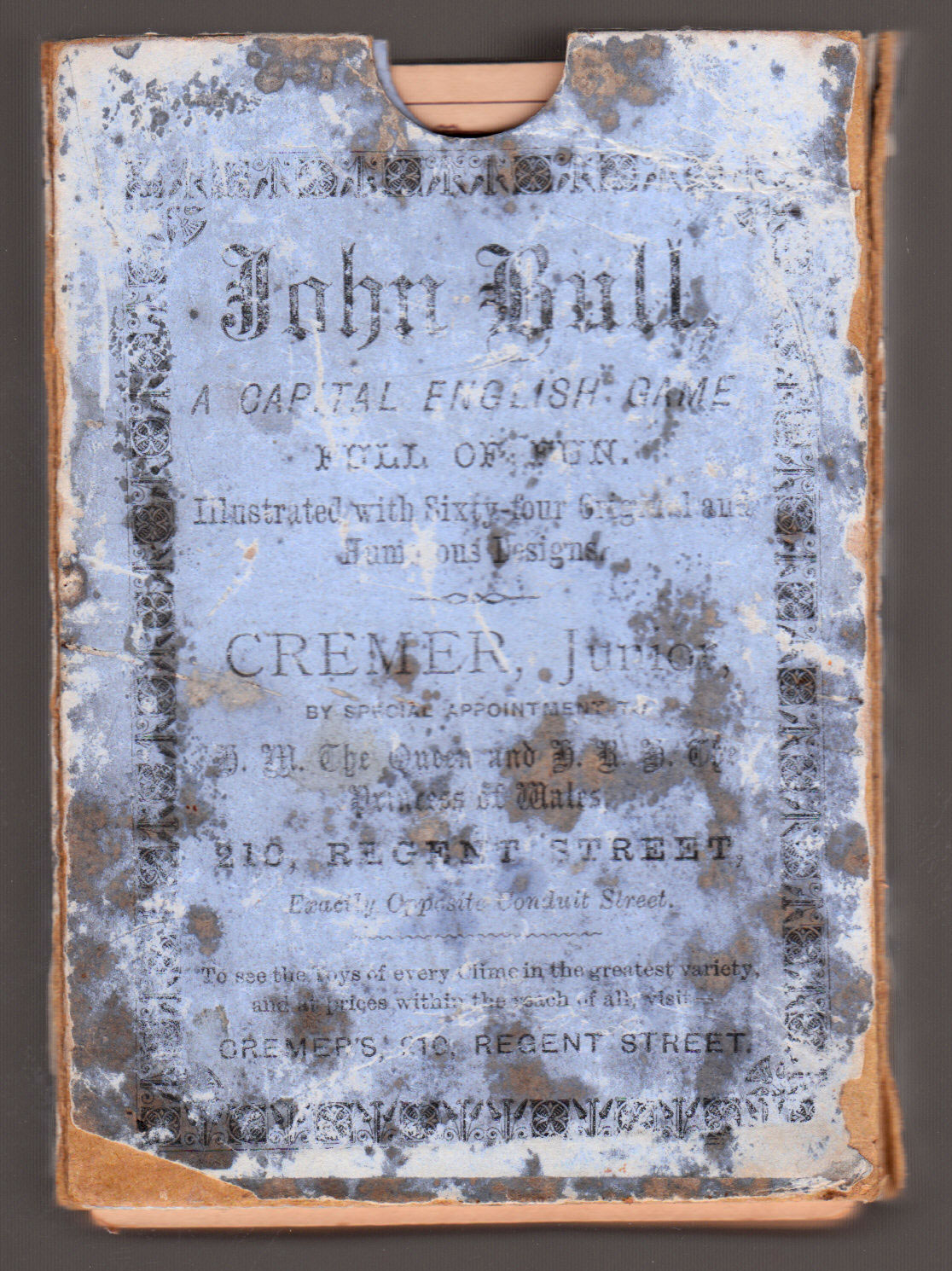W Cremer was an importer and manufacturer of toys and games at 27 New Bond Street, London in c.1860 and his son W H Cremer junior at 210 Regent Street from c.1861-c.1880. “John Bull” - based on the satirical personification of the United Kingdom by Dr. John Arbuthnot - is a quartet card game similar to Happy Families consisting of 64 original, humorous cartoons organised into family groups of four cards. See the Instructions►