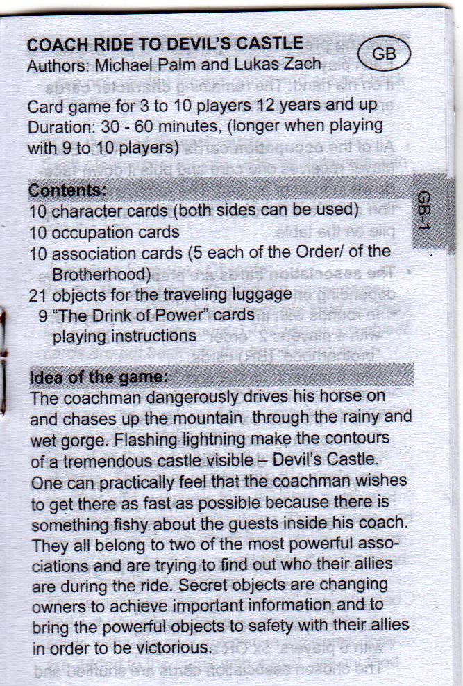 Above: “Die Kutschfahrt zur Teufelsburg” or “Coach Ride to Devil’s Castle” by Michael Palm and Lukas Zach, published by Adlung-Spiele in 2006. 60 cards + multi-ligual rules booklet in box.