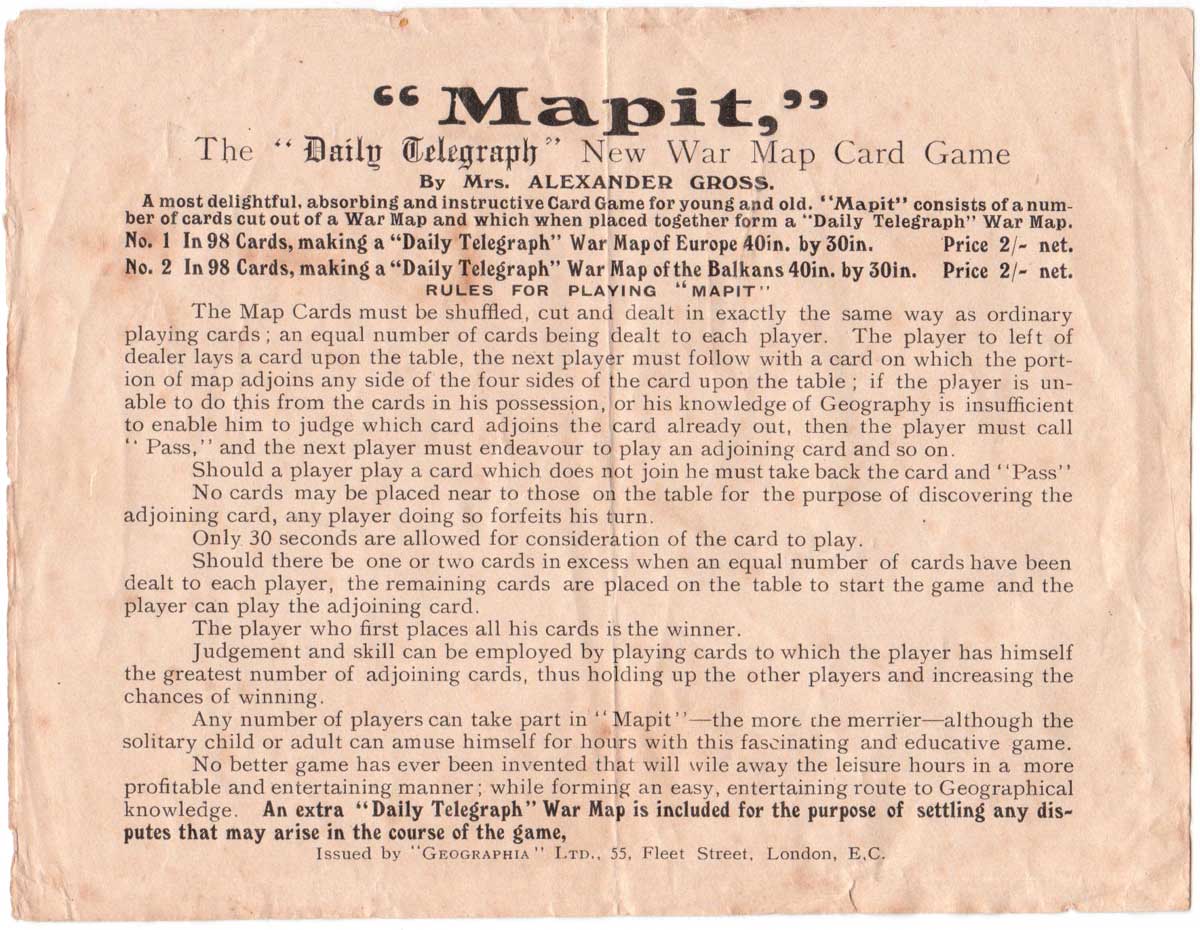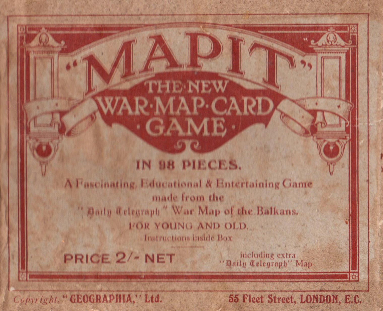 “Mapit No 10 The Balkans and Eastern Europe” war map card game published by Geographia Ltd, 55 Fleet Street, London E.C. The date is certainly during the second World War, c.1940. It’s a kind of cross between a jig-saw and dominoes and is described on the box as “fascinating, educational & entertaining”. “Mapit” consists of 98 cards cut out from a war map which when placed together form a full map. The cards have been made by sticking a whole map to card and then cutting into game cards. See the Rules►