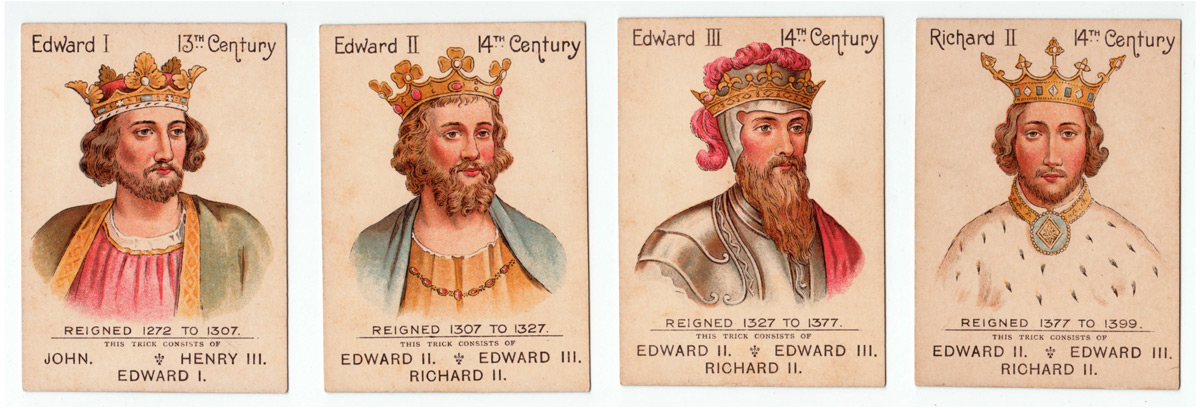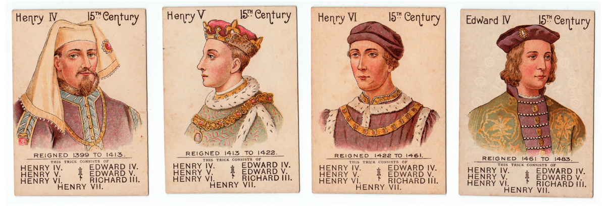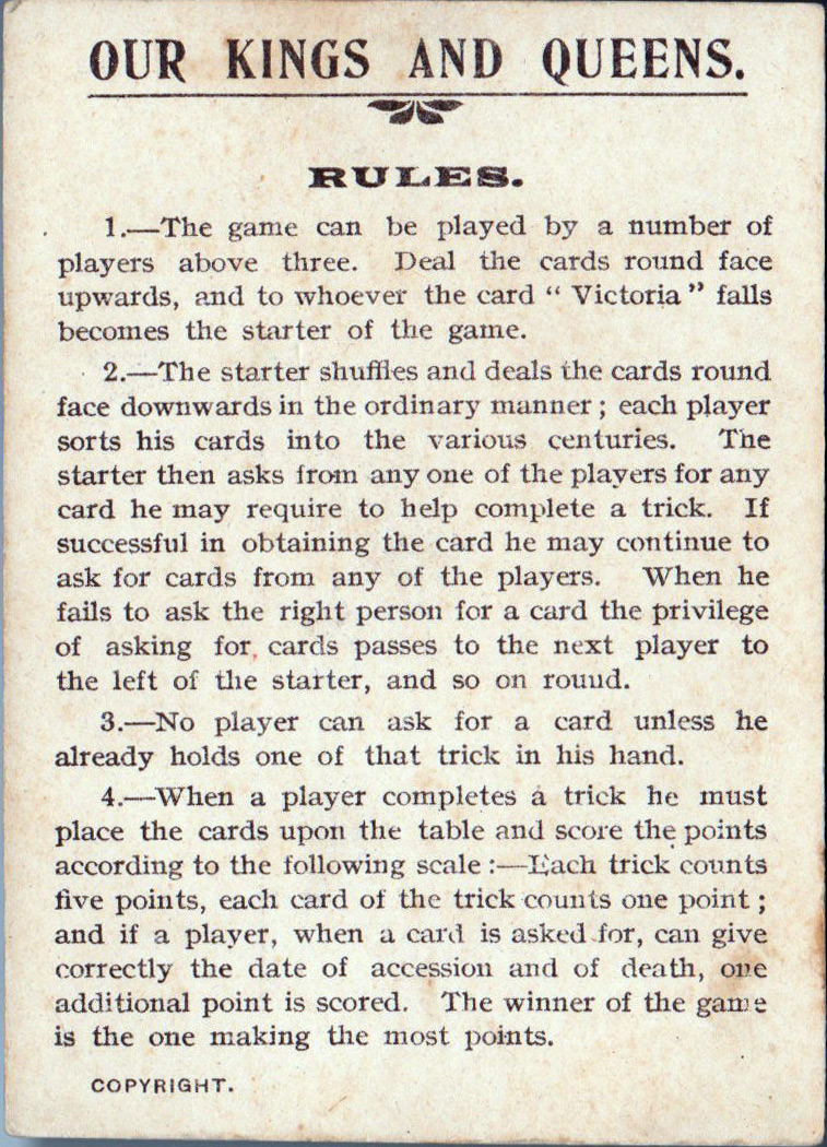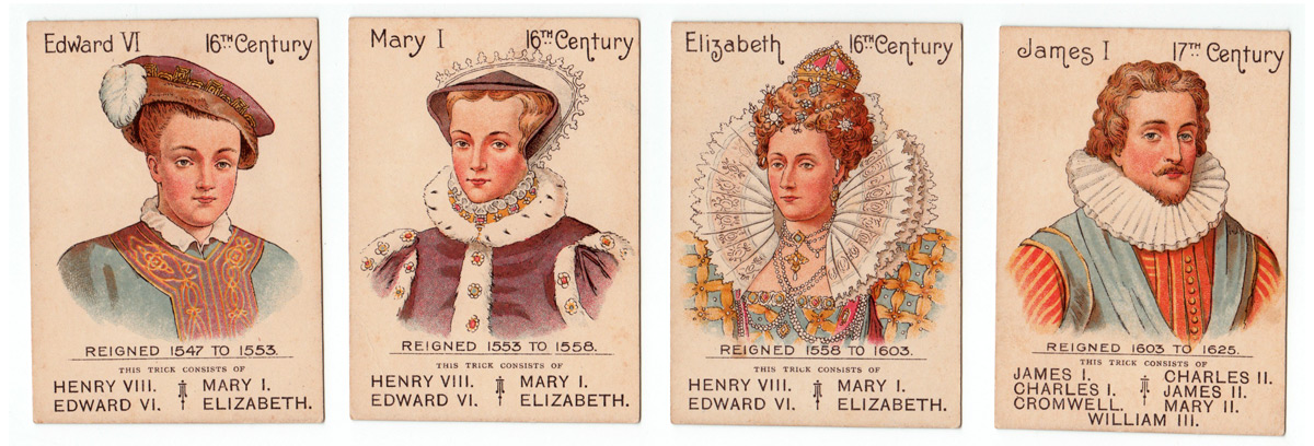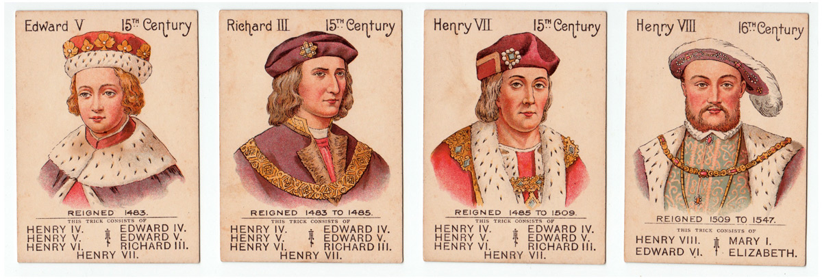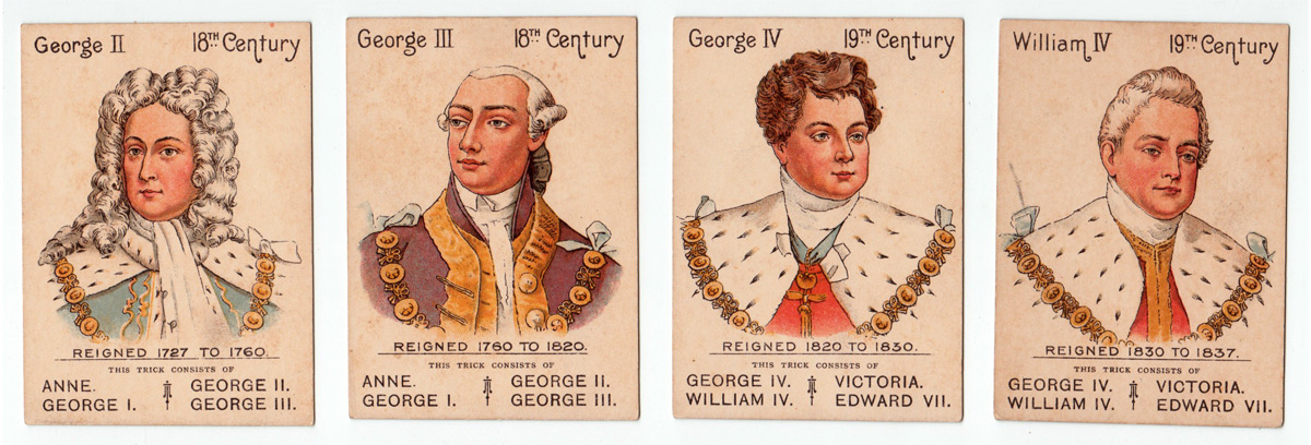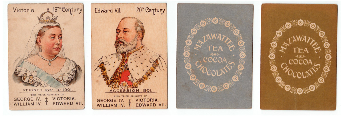 The Mazawattee Tea Co’s promotional card game “Our Kings and Queens” was first published in around 1901 or soon after and depicts British monarchs from William I to Edward VII. There were probably tokens packed with the tea and customers collected them for a pack of this game, which has an obvious educational benefit. The aim of the game is to collect ‘families’ of monarchs. At the same time, the backs of the cards advertise tea, cocoa and chocolate drinks. The set contains 38 cards + the Rules.
