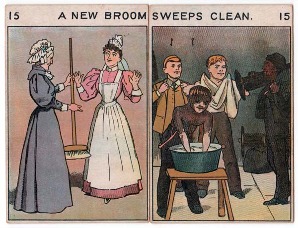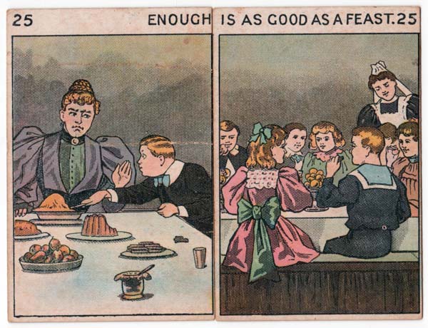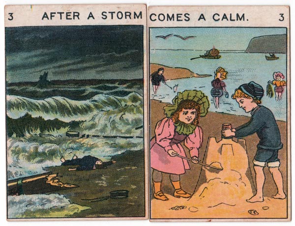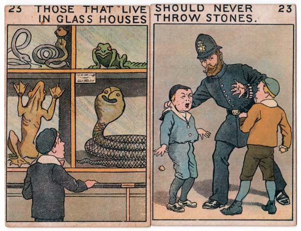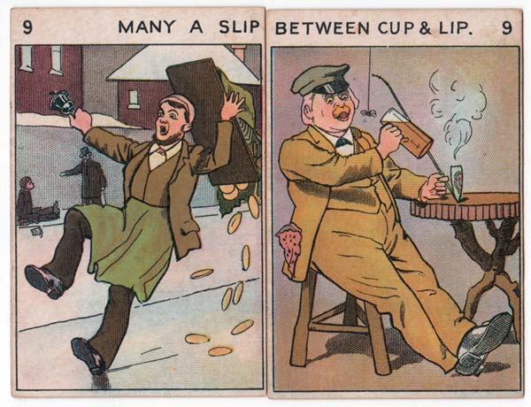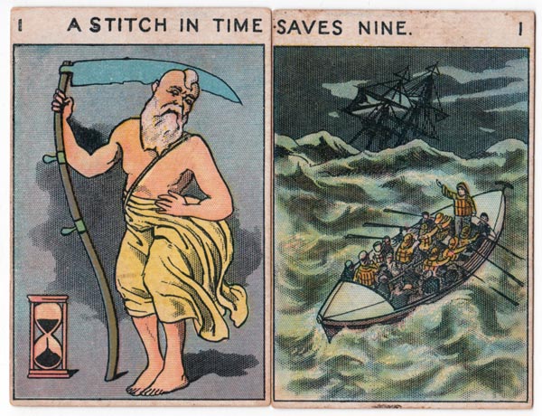 Many of these proverbial sayings are still used in many households on a regular basis and others are relics of a time and era which has taken its place in the past. On the box (shown left) the designs are described as "amusing, humorous & artistic". Some of the illustrations show the social inequalities with prosperity for some and poverty and misery for others. It was a time of great inventiveness but also a time of great upheaval. Advice and quotes were always at hand, whether one belonged in the upper or lower classes.